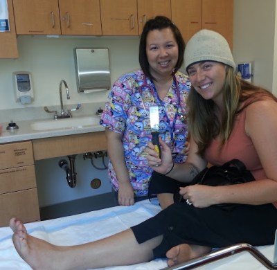 We had a late start on this simi-good day, only a slight chance of rain. We pull the heat gun and scraper out to finish the stripping of the varnish. Not 5 minutes into working, actually probably 3 minutes in Shannon slips and runs her bare foot into my hot sharp metal scraper. Now there are lots of ways to avoid this kind of accident, namely wearing any kind of footwear, but it happened anyways. I looked at the injury it had cut open the bottom of her “index” toe. It wasn’t bleeding bad but was extremely deep. I was concerned about stitches and tetanus. I then asked Shannon when her last tetanus shot was, she said she couldn’t remember the last time she got a booster, not a good thing to hear when your are supposed to have one every 5 years. Well off to urgent care we went. About a 15 minute drive then about a 30 minute wait. The nurse met us and flushed the wound, then called the doctor in. Doc said it can be glued back together. Doc administered the glue with a prompt tetanus shot. Then I had to hear about how much her arm hurts for the next 3 days.