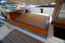 We worked off and on with the varnish stripping for the next two days and last night we finished all of the final sanding with 220 grit. This morning we woke up and did the last spot sanding, filled a few random screw holes with epoxy. Then taped and wiped the surface for our first coat of Cetol Natural Teak.