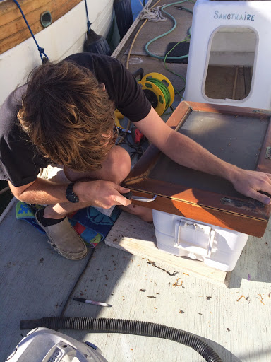 While the winches were off becoming all pretty again Jon serviced all the working parts of all 8 winches. Then it was on to the very large job of scraping all the brown CeTol off our beautiful teak. I don’t think we realized really how much bright work this boat had till we were aching and bitching about our back after 3 days of all day scraping, and we are STILL NOT DONE! We do however only have half of the port side cap rail left to do. It never ends. While all the varnish is off we are re-calking all the seams that needed to be done; which includes the seams in the cockpit, all hatches, and even around the hand rails ( which seem to be leaking… now we can’t have that!)