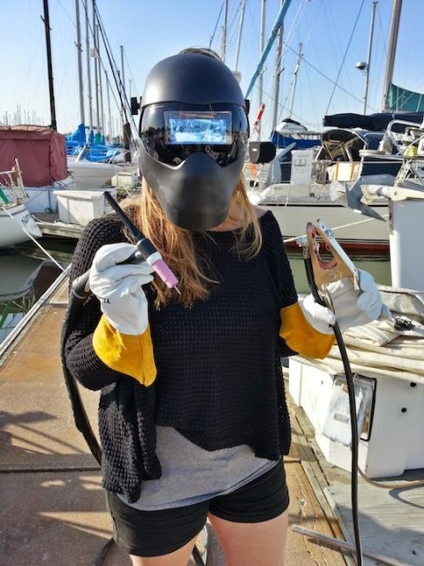 | Shanny all decked out practicing her TIG welding |