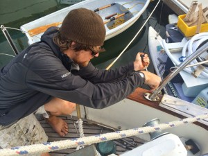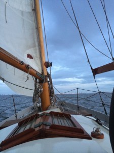 We had a great time at the boat show, met up with my mom and brother and spent two days looking at gear and production boats. Shannon Scored a seriously comfy pillow because her current on was over seven years old, eww… I talked down the Helly Hansen girl for our friend Lowell and got him some offshore foulies for $350 out the door (Jacket and bibs)! While we where in our guest slip at jack london, I did notice something off with Prism. The Docks at this marina are quite taller than our docks back in Berkeley and with this different vantage I found some cracking on the bowsprit. I pulled out my knife and popped off what I though was paint but was actually 1/8” epoxy fairing with white paint. Under this epoxy coating was very dark wood. Not a good sign. I then stuck the tip of my knife into this spot and pushed in. My Blade went in about 2”! “Tikes” I thought “this I was not expecting” I tell Shannon the news, I don’t think she fully got what was going to need to happen when I got back to Berkeley (remove the furling, pulpit, anchor, lifelines and bow sprit). At this point I could only think of this stupid rot, luckily the show was about done and all we had to do is get back on the boat and sail back to Berkeley. After dodging a few cargo ships, we got back into south bay. We where then hit by 20knts on the nose from the north. Not the direction or velocity of wind I was hoping for with a compromised sprit. The wind 99% of time blows from the west so this north wind was not normal and was coming right to where we wanted to go. Under full main and staysail we pounded up for 2hrs until we rounded the Berkeley pier and then made a right for a beam reach into harbor.