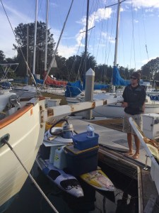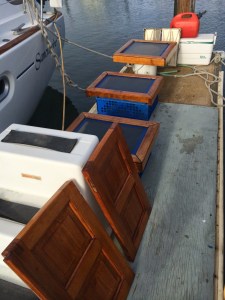 Because we did not haul out and we had bought a bunch of new stuff to replace the old, we now had nowhere to store it. So Jon went out on recon and found some old windsurfing boards. You can imagine as I am on my bike ride back from work and see Jon rowing our dinghy with a surfboard in tow. Not a sight you see all the time. We strapped the 2 together and put all our “stuff” piled on top. It is pretty honky looking, but for the time being.. it works wonderfully.