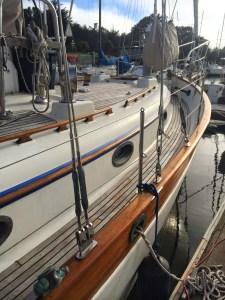 So back to me telling Jon he will have fun painting our mast 🙂 As he was sanding he found 2 things that you never want to find when dealing with your mast. The first was out mast is bending, a lot…. but that can be fixed when tuning the rig. Second we found a kink/dent. This made our stomachs drop. We had pretty much everyone in the yard take a look and tell us what they thought. The winning vote: GET A NEW MAST. Damn! We were not planning on this at all! But that’s how it always happens, a simple project turns into something way bigger. We contacted our insurance (BoatUS) and got the ball rolling on getting our mast checked out and start looking for a new. We had a 50/50 chance of the new mast being covered 100% by insurance. However they wanted to know the million dollar question: “How did it happen?” Apparently our “Uh, we have no idea, don’t know where or when it happened” was not the answer they were looking for, and told us that it would then have to be under the “wear and tare” option… and that is NOT what you want when you are trying to get insurance to help pay! So they sent out a surveyor to check out our mast.. he never said a word to me, asked someone in the yard where he could find the mast to the HC33 and when to look. We never heard anything from anyone. A few days later the main guy from Ballinger was in the yard getting a few things, He stopped to look at our mast, I felt kind of special.. I mean this guy is THE MAST GUY! Any who…. come to find out, the insurance surveyor guy asked the Ballinger guy to look at our mast cause he “didn’t know what to think and needed a 2nd opinion”. Then I got the news… WE DO NOT NEED A NEW MAST! WHOPP WHOPP! I was told that the kink in the mast has most likely been there since it was made, it was not caused by sailing and there is no need to worry about it. The Bend is also nothing to worry about, as it was not caused by the kink. SO back to the project of getting it painted, wired, put folding steps on it and get it back on our boat!