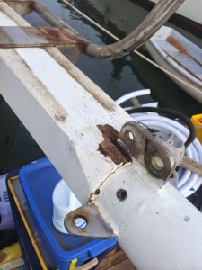 Over the next couple of days I managed to get down the furler with the help of Bob for the final drop of it. Later that week I sold the unit and the torn sail for $800 to a nice guy named Tony for his Rafiki 37. Side note, our HC33 with 43′ food mast has the same length jib stay as a rafiki 37 forestay. I managed to remove the the anchor, lift off the pulpit and slide out the sprit all in one day. It was actually a really easy process. I then brought the sprit over to the yard once agin calling upon Bob and his truck to help me move out 9 foot 130lb Apatong sprit. Once at the yard I got the help of the local wood boat specialist (Steve Hutchenson) to help me pop off the Cranze Iron. Once the iron was off we then could see the true depth of the rot in the sprit. The entire tip the was “sealed” under the crazne cap and was black. You could just grab and rip off a 1/4” of wood with your finder nails. not good. The design of the cranze was obviously not a great one, I immediately got on the phone with Port Townsend Foundry to get the ball rolling on a new bronze one. I spoke to Steve and he recommend that I could just scarf the last 3 feet of the sprit and it would be plenty good. He was quite busy so he couldn’t do it. I like to think I know where my personal limits are with boat projects. Im decent at most boat projects, but with wood I’m just Ok. I didn’t think rebuilding the single most important piece of wood on the boat would be a good training project to learn how to scarf load bearing hardwoods. I then ran into a guy that said all he did was repair spars. Casey quoted me what I thought was a fair price and did all the scarfing for me. The sprit currently is at Casey’s shop done, waiting for the very allusive cranze iron from PTF. Once we get the cranze we just need to shape the front of the sprit and paint it up. So two weeks ago while the sprit was off I got to thinking. My thought was while the sprit was off I might as well drop the rig and knock that out. All I wanted to do was replace all the lights with LED and rewire and put the wire into the conduit. So two weeks ago I motored over to BMC and had them crane off the mast. With a little coaxing with a 10lbs hammer to pop out the tabernacle pin we where off to the races. Once the mast was on stands Shannon decided to take a break from work and go see how her mast looked like off the boat. The first thing out of her mouth was “ahhh, we need to paint this” I gave her a little eyebrow raise look and said “we?” the she proceeded with “Have fun with that”. This changed the size of this project immensely. Now I had to strip the mast off of all hardware which I hate doing because all the screws are seized and then sand and paint. So I set off in my corner, marking all the rigging and nicely rolling them up. Sadly the next day I came back to work and found all my rigging in a big tangled mess on the concrete. Apparently I left them in the wrong place and someone felt compelled to chuck them across the yard. Not only did I have to untangle and re-roll all the stays but it also screeched the crap out of three of the newly replaced HI-mod shrouds we had just put on the boat 8 months prior. Ohwell, one more thing to polish I guess. The hardware came off just about exactly like I imagined, terribly, breaking off about 80% of all fasteners even after heating till orange and removing by hand. Who ever commissioned this mast in 83′ used no countermeasures for corrosion.