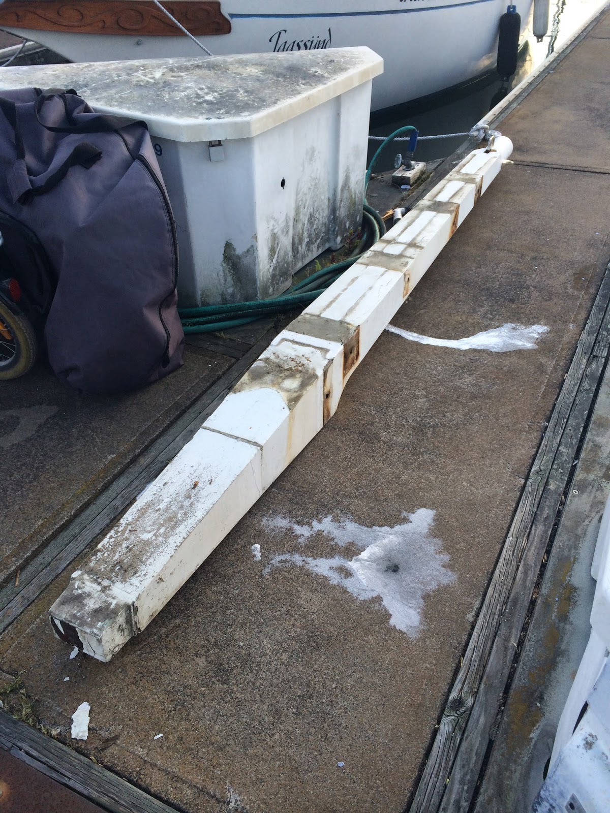 We had a great time at the boat show, met up with my mom and brother and spent two days looking at gear and production boats. Shannon Scored a seriously comfy pillow because her current on was over seven years old, eww… I talked down the Helly Hansen girl for our friend Lowell and got him some offshore foulies for $350 out the door (Jacket and bibs)! While we where in our guest slip at jack london, I did notice something off with Prism. The Docks at this marina are quite taller than our docks back in Berkeley and with this different vantage I found some cracking on the bowsprit. I pulled out my knife and popped off what I though was paint but was actually 1/8” epoxy fairing with white paint. Under this epoxy coating was very dark wood. Not a good sign. I then stuck the tip of my knife into this spot and pushed in. My Blade went in about 2”! “Tikes” I thought “this I was not expecting” I tell Shannon the news, I don’t think she fully got what was going to need to happen when I got back to Berkeley (remove the furling, pulpit, anchor, lifelines and bow sprit). At this point I could only think of this stupid rot, luckily the show was about done and all we had to do is get back on the boat and sail back to Berkeley. After dodging a few cargo ships, we got back into south bay. We where then hit by 20knts on the nose from the north. Not the direction or velocity of wind I was hoping for with a compromised sprit. The wind 99% of time blows from the west so this north wind was not normal and was coming right to where we wanted to go. Under full main and staysail we pounded up for 2hrs until we rounded the Berkeley pier and then made a right for a beam reach into harbor.