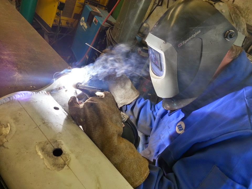 | Shanny all decked out practicing her TIG welding |