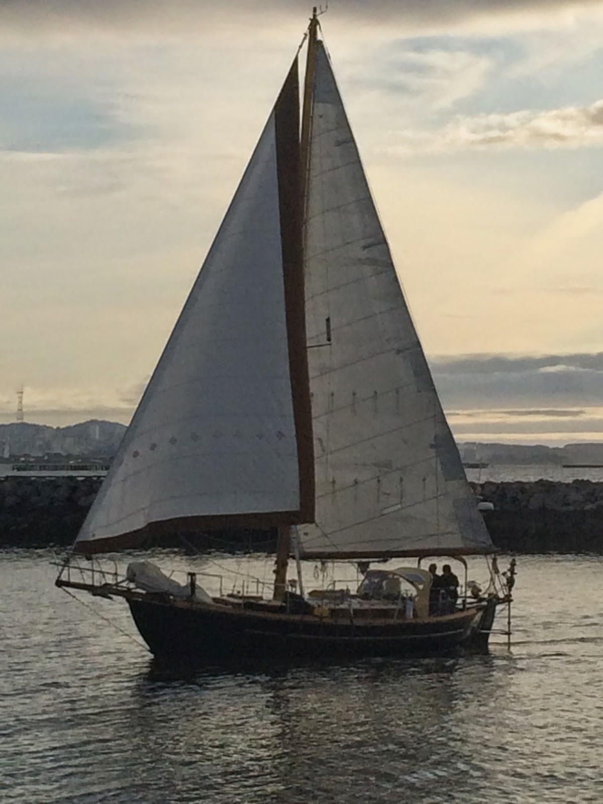 We have been out sailing in the warm spring weather before the cold and windy summer sets in! We have been out buddy boating with our friends Josh and Bob. Josh has a BCC30 (Bristol cannel cutter) and Bob has the best looking westsail 32′ you have ever seen. Jon and I were amazed on how well Prism did when sailing with those guys… we pretty much left them in the dust. Yes I am sure our HUGE 130% genoa had a lot to do with it, but still! We had a blast, headed over to TI (Treasure Island)and rafted up with Josh for a late lunch/early dinner and some drinks. We all took afternoon naps in the wonderful cove in the warm sun and enjoyed a great sunset sail back to Berkeley. We both got some amazing photos of our boats as we sailed home.