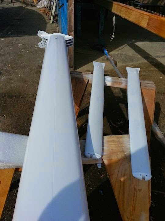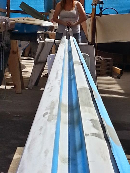 So back to me telling Jon he will have fun painting our mast 🙂 As he was sanding he found 2 things that you never want to find when dealing with your mast. The first was out mast is bending, a lot…. but that can be fixed when tuning the rig. Second we found a kink/dent. This made our stomachs drop. We had pretty much everyone in the yard take a look and tell us what they thought. The winning vote: GET A NEW MAST. Damn! We were not planning on this at all! But that’s how it always happens, a simple project turns into something way bigger. We contacted our insurance (BoatUS) and got the ball rolling on getting our mast checked out and start looking for a new. We had a 50/50 chance of the new mast being covered 100% by insurance. However they wanted to know the million dollar question: “How did it happen?” Apparently our “Uh, we have no idea, don’t know where or when it happened” was not the answer they were looking for, and told us that it would then have to be under the “wear and tare” option… and that is NOT what you want when you are trying to get insurance to help pay! So they sent out a surveyor to check out our mast.. he never said a word to me, asked someone in the yard where he could find the mast to the HC33 and when to look. We never heard anything from anyone. A few days later the main guy from Ballinger was in the yard getting a few things, He stopped to look at our mast, I felt kind of special.. I mean this guy is THE MAST GUY! Any who…. come to find out, the insurance surveyor guy asked the Ballinger guy to look at our mast cause he “didn’t know what to think and needed a 2nd opinion”. Then I got the news… WE DO NOT NEED A NEW MAST! WHOPP WHOPP! I was told that the kink in the mast has most likely been there since it was made, it was not caused by sailing and there is no need to worry about it. The Bend is also nothing to worry about, as it was not caused by the kink. SO back to the project of getting it painted, wired, put folding steps on it and get it back on our boat!