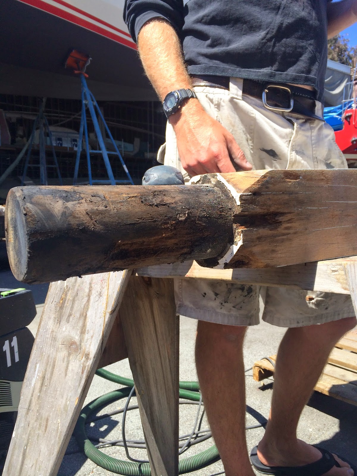 Over the next couple of days I managed to get down the furler with the help of Bob for the final drop of it. Later that week I sold the unit and the torn sail for $800 to a nice guy named Tony for his Rafiki 37. Side note, our HC33 with 43′ food mast has the same length jib stay as a rafiki 37 forestay. I managed to remove the the anchor, lift off the pulpit and slide out the sprit all in one day. It was actually a really easy process. I then brought the sprit over to the yard once agin calling upon Bob and his truck to help me move out 9 foot 130lb Apatong sprit. Once at the yard I got the help of the local wood boat specialist (Steve Hutchenson) to help me pop off the Cranze Iron. Once the iron was off we then could see the true depth of the rot in the sprit. The entire tip the was “sealed” under the crazne cap and was black. You could just grab and rip off a 1/4” of wood with your finder nails. not good. The design of the cranze was obviously not a great one, I immediately got on the phone with Port Townsend Foundry to get the ball rolling on a new bronze one. I spoke to Steve and he recommend that I could just scarf the last 3 feet of the sprit and it would be plenty good. He was quite busy so he couldn’t do it. I like to think I know where my personal limits are with boat projects. Im decent at most boat projects, but with wood I’m just Ok. I didn’t think rebuilding the single most important piece of wood on the boat would be a good training project to learn how to scarf load bearing hardwoods. I then ran into a guy that said all he did was repair spars. Casey quoted me what I thought was a fair price and did all the scarfing for me. The sprit currently is at Casey’s shop done, waiting for the very allusive cranze iron from PTF. Once we get the cranze we just need to shape the front of the sprit and paint it up. So two weeks ago while the sprit was off I got to thinking. My thought was while the sprit was off I might as well drop the rig and knock that out. All I wanted to do was replace all the lights with LED and rewire and put the wire into the conduit. So two weeks ago I motored over to BMC and had them crane off the mast. With a little coaxing with a 10lbs hammer to pop out the tabernacle pin we where off to the races. Once the mast was on stands Shannon decided to take a break from work and go see how her mast looked like off the boat. The first thing out of her mouth was “ahhh, we need to paint this” I gave her a little eyebrow raise look and said “we?” the she proceeded with “Have fun with that”. This changed the size of this project immensely. Now I had to strip the mast off of all hardware which I hate doing because all the screws are seized and then sand and paint. So I set off in my corner, marking all the rigging and nicely rolling them up. Sadly the next day I came back to work and found all my rigging in a big tangled mess on the concrete. Apparently I left them in the wrong place and someone felt compelled to chuck them across the yard. Not only did I have to untangle and re-roll all the stays but it also screeched the crap out of three of the newly replaced HI-mod shrouds we had just put on the boat 8 months prior. Ohwell, one more thing to polish I guess. The hardware came off just about exactly like I imagined, terribly, breaking off about 80% of all fasteners even after heating till orange and removing by hand. Who ever commissioned this mast in 83′ used no countermeasures for corrosion.