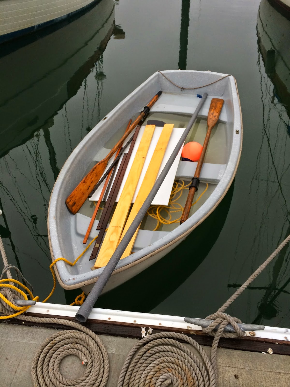 Because we did not haul out and we had bought a bunch of new stuff to replace the old, we now had nowhere to store it. So Jon went out on recon and found some old windsurfing boards. You can imagine as I am on my bike ride back from work and see Jon rowing our dinghy with a surfboard in tow. Not a sight you see all the time. We strapped the 2 together and put all our “stuff” piled on top. It is pretty honky looking, but for the time being.. it works wonderfully.