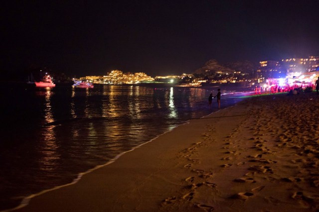 Sean decided to take us out to dinner, a “BIG” night out. We could have eaten anywhere we wanted, but we went to a little place on the side of a back alley that had been teasing our senses for the last 3 days. Jen and John from “Summer” joined us. We ate amazing tacos, burritos. and Sean and I ordered the horchata, which Jon sipped off. Next we all decided to walk down the beach to see what the resorts had going on for the night. We stopped at a corner liquor store, stocked up on a few 8packs of pacifico and made our way to the beach. Because of the all the resorts there in really only 1 way on and off the beach.. a small access point right next to the break water of the marina. The resorts don’t allow non-guests to pass through. So we walked down the large curving beach only to find that all the resorts and their beach parties were blocked off to any outsiders. The further down we went, the less the crowed it became, with a few of the resorts offering tables for the night. The offer was: A table for all 5 of us for the premium of one bottle service… which means if we bought a bottle of what ever booze we wanted we could stay at the table the whole night and watch the fireworks from there. Tempting, but not what we were looking for. We started to make our way back, and found a break in the resorts up to a parking lot. We made a break for it, and found ourselves in a back ally and then a random liquor store. We all bought 40’s, went back out to the street, not really knowing where we were. We decided to have an adventure to find our way back to the marina. It didn’t take long till we found the main road and we were back in downtown within minutes. It was about 10:30pm at this point, all the clubs started to get rolling. Each place had it own kind of music, mostly was all music from the top 10 hip-hop list from the states. You can just tell that Cabo is just americans playing the “what happens in Mexico, stays in Mexico” card. We went back to “Summer” finished our beers and we all made our way out to PRISM to watch the fire works.