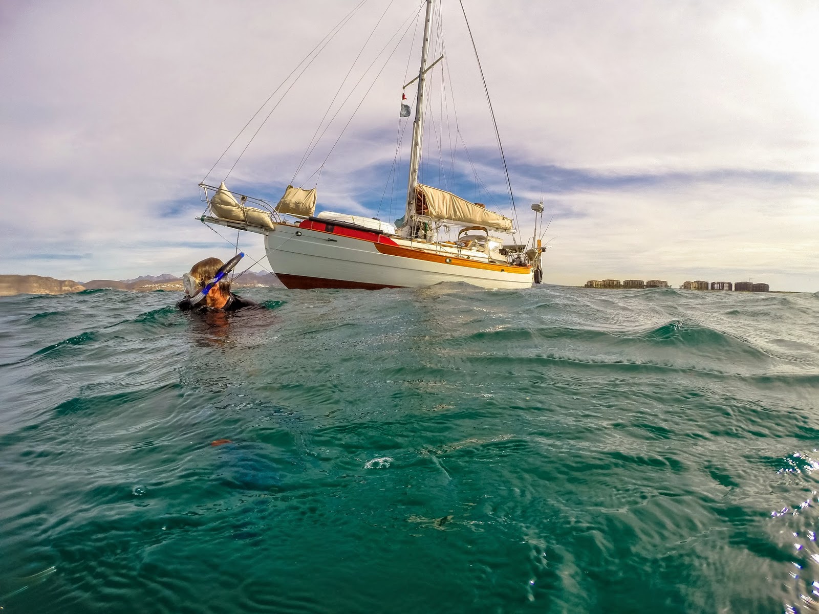 The day before we had to be in the marina we stopped to check out the whale sharks. Finally some SHARKS!!! We had heard from other cruisers that the local panga tour guides guys can be rather pushy and mean, making you anchor way out and dinghy into the shoal area where the sharks hang out. But we got lucky. There were only 2 panga boats out there with us. The wind was blowing and causing some annoying chop, so Jon stayed on the boat while Sean and I jumped in as soon as we saw the first shark. Sean and I had to swim as fast as we could to keep up with the shark. Jon ended up towing us around to bring us closer to the sharks. The Chop and cloud cover made it hard to see where the sharks where, so Jon also acted as the look out. He would yell to Sean and I to swim left or right. The visibility was only about 5 ft so it was a shocker when swimming as fast as you can, then WHAM WHALE SHARK! So far it is the highlight of Mexico.