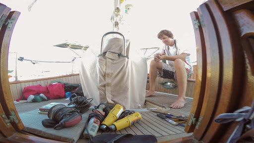 About 8 feet of our starboard side cap rail was beyond repair, so I decided we should take that whole section down to bare wood.Thank goodness for heat guns! We prepped the entire boat and added 3 coats of pigment to all the bright work. So areas that where not scraped down all the way now have 6 coats of pigment. It actually blended pretty well and our boat look good again. We plan on giving it two more coats with the gloss while on the hook in the next couple of days. Other Projects consisted of fixing the VHF radio. Three of my four connectors on the coax cable where done incorrectly by me, you must make sure not to have any shielding touching the middle core wire of the whole system will not work. Most of the connections where pretty easy to get to minus the one at the top of the mast. We are pleased to have a fully functional VHF now that can broadcast and receive at much greater distances than our handheld Vhf that works about as well as yelling to the person you are trying to contact. I also Installed our new exhaust elbow. This item was fun to explain to the security guy when going though TSA. Needless to say along with the elbow, we also had a sling shot and a plastic fly gun, all three items had to be reported, then Jon was escoted back out of the check area, and was asked to check his bag… good thing we were early to the airport!