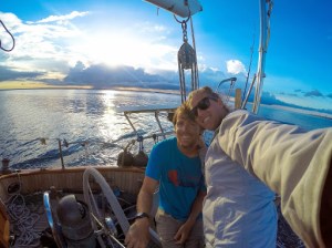 I’ll give it to Jon, yes I was not happy that we had to beat into weather for 5 hours, but the anchorage is one of our favorites and it was 100% worth it. Ill blame my bad mood on the PMS. We met up once again with S/V Molly and Mouse Pad. We all enjoyed the calm warm weather that the islands have to offer. We all took a dinghy adventure to the next cove over to check out the reef. The water was much colder up there than in Lobos or Balandra. But it was very nice, and when we go back, I will be bringing my pole spear on the next dive to find those large groupers that were hanging around. We headed back to La Paz with a good east wind on monday. The weather was perfect, as we made our way we took a moment to remember Jon’s dad who passed away on this day 3 years ago, we took a shot of whiskey, pored a shot for him and thanked him for the nice sailing today and all the great memories and lessons he gave us. We left the island with sunny skies, and almost no clothing. But as we approached the channel we could see that we were going to be in for a good sail. As we were thinking about putting a reef in, we got a text message from Jess asking “ how are you guys doing in the storm out there?” Funny she should ask, although we counldnt really call it a storm. We caught the back end of the squall, so at most we had 18 knots on the beam with small chop and only a little rain, lasting about 20 min. Once we made it past the channel and in the lee of Punta Tecolote the sun came out, and we shook out the reef. By the time we were about 5 miles out from the La Paz channel entrance, the wind completely died. We could have pulled into Lobos again and waiting till the morning, but we just fired up the engine. We motored sailed in. Just as we were about 1 mile from the anchorage, a south wind whipped up, which made anchoring a very interesting task. Not only was the anchorage very full with boats anchored very close to each other but the south wind was blowing about 10 knots and the current was going the other direction at about 5 knots. So when we tried to anchor and back down, we could not get the boat to back up the way we wanted her to go, she just kinda went side ways. Very interesting, all the boats in the area were doing the waltz, so we decide to bail and anchor out almost in the channel away from dragging anchors and drama. Once we got the boat set, we were very happy to look over and see our friends Daniel and Michelle on “Kaia” anchored right there. We thought that they had already left for mainland and then the south pacific. We rowed over to say hello, then made our way over to Jess and Josh’s to fry up some of the bonita we caught on the way in.