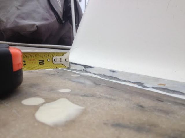 The Mason: So once we got all the holes filled and the deck looking as smooth as it is going to get, mom reminded us that she wanted us to fill in the gab between coach roof and deck, as there was a steep lip from where the teak used to butt up against the Coach roof. As of now, I think that this was the hardest part about the whole ” remove the teak decks” project. Jon and I started off by testing a 3 foot area by filling it with very think epoxy. After we saw how much epoxy and filler we were going to need to complete the whole lip, we quickly got to thinking of what else we could use to make this easier, faster and cheaper, but still look good and be solid. Our answer: BONDO, yep bondo like for cars. We made small batches and using a plastic paint scraper we made the perfect bevel to the annoying lip. This did take 2 trips around, and about 1.5 gallons of bondo. Once we were happy with the smooth new surface we threw epoxy on it to seal it up!  Done and done. . well that is till we put the first coat of primer on and it shows us all of the little imperfections we have missed. That is going to be fun!