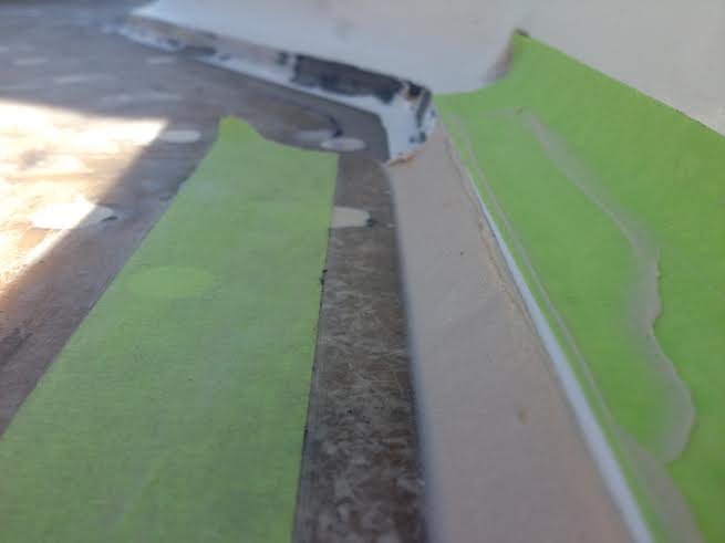The Mason: So once we got all the holes filled and the deck looking as smooth as it is going to get, mom reminded us that she wanted us to fill in the gab between coach roof and deck, as there was a steep lip from where the teak used to butt up against the Coach roof. As of now, I think that this was the hardest part about the whole ” remove the teak decks” project. Jon and I started off by testing a 3 foot area by filling it with very think epoxy. After we saw how much epoxy and filler we were going to need to complete the whole lip, we quickly got to thinking of what else we could use to make this easier, faster and cheaper, but still look good and be solid. Our answer: BONDO, yep bondo like for cars. We made small batches and using a plastic paint scraper we made the perfect bevel to the annoying lip. This did take 2 trips around, and about 1.5 gallons of bondo. Once we were happy with the smooth new surface we threw epoxy on it to seal it up!  Done and done. . well that is till we put the first coat of primer on and it shows us all of the little imperfections we have missed. That is going to be fun!