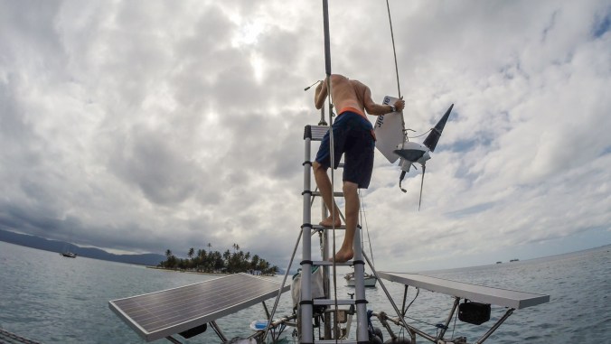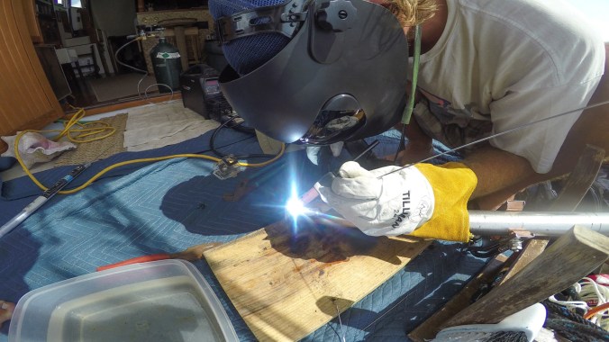 We now had almost all the parts needed to install our new Ampair wind generator. The last step was to find someone with a big enough generator to run our tig welder. And wouldn’t you know it, we happened to have become friends with a powerboat. MV Sea Life. These guys are so fun, Scott reminds me of me, as in he is loud and I love it! Scott offered to let Jon come over and take up his whole back deck to finish our project as he needed to run his generator during the morning to top up his batteries. Jon brought all our welding crap over to Sea Life when they finished up by the afternoon Jon and I set out to get it up onto the old radar mast pole and plug it in! Boom baby! We got power!!