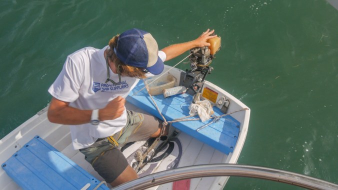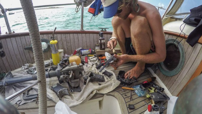 Oh update!!! So while we were in Panama city our trusty ol’ evenrude outboard died. I had brought back almost every removable/ replaceable part when I came back from my sister’s wedding, as Jon was determined to fix it. Well as it turns out… the one part I did not bring back with me, the power pack, was the faulty part! Which is a part that is no longer made! Damn. Prism was once again outboard-less. So a few weeks ago Jon posted a wanted post on the San Blas cruisers Facebook page. Within the first day we were contacted by a man in Cartagena , who had an old Yamaha which he had not used for the last 2 years. But if we wanted it, it was free to us! He even arranged it to be brought to the San Blas on a friends boat who was heading this way. Score! A week later we met up with the boat ” Changing Tides”, and were happy to meet the lovely couple who have been cruising the area for over 12 years! They brought out the old 2hp 2 stoke outboard that can easily be lifted with one hand. In return I had baked them a fresh loaf of English muffin bread as a thank you. After 2 days of breaking it down, giving it a good clean and lube job, Jon put in some fresh gas (mixed of corse), gave it a quick spray of starter fluid and vroom vroom, the bad boy started! Whoop whoop!!