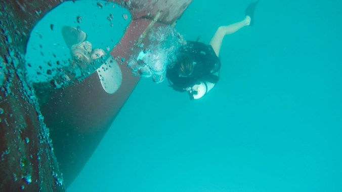 The water surrounding the Islands is not the best for water quality, as in you don’t want to get in because the fully populated towns drain their sewage right into the water. Yummy. So you can imagine my disappointment when we lose something overboard, forcing me to dawn dive gear and get in…. I’m sure you’re wondering… what in the world would make anyone get into murky muck, poop and crocodile infested water….. well remember that new to us outboard I was just typing about…. yeaaaaa. We were getting ready to head into town, so Jon moved the outboard off the rear railing onto the side railing to make it easier to put into the dinghy. Well our new to us outboard is missing one of the tie down dogs, so when our dinghy painter got tangled up near the prop, it twisted the perfectly sitting outboard right off the side rail. Jon even watched it in slow motion as it happened from in the galley. All I heard was ” aw f*ck”, I reluctantly asked what it was that just made the splash noise, sacred of the answer and knowing the answer, but even more scared of the next step. Jon had the perfect arguments as in ” Shannon I can’t free dive that far, so you should do it, we are only in 35 feet so you don’t need the dive gear” as true as that is, he forgot to factor in the fact that the visibility was less than 6 inches AND THAT THE WATER IS POOP WATER!!! lets just say I knew from the moment I heard the splash I was going in.