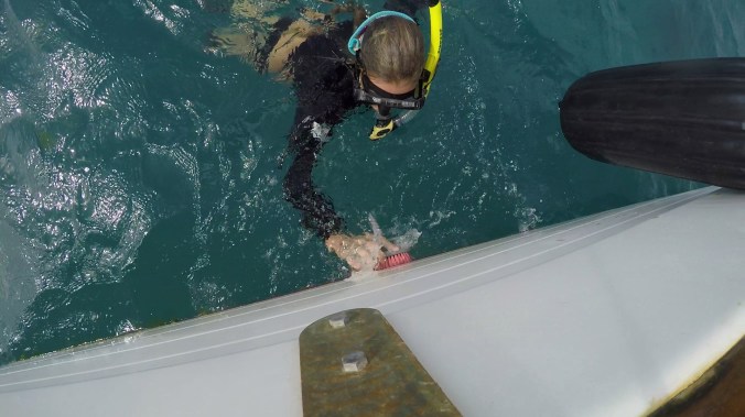 THE OUTBOARD! Sweet! Ha that was luck. I tied a knot on it and gave the line 2 tugs to signal Jon to start pulling up, but instead more line came down, so I pulled again… more line, and again. Gez I was thinking we should have talked this over before I descended. Lol. The last thing I was going to do was let the outboard out of my sight, so I pulled on the line one last time, this time a very hard jerk hoping Jon would get my message. Up the line goes and up the motor goes. Yes he understood!! Once at the surface I pretty much levitated out of the water and went right into an alcohol and hydrogen peroxide shower. Okay, so I am exaggerating about that, but I did strip down and use about 15 gallons of fresh water and 100oz of soap to wash off. By the time I was clean, Jon had the outboard running again. Wow we do love a Yamaha!! Lucky for us, somehow no water had gotten into the fuel tank, nor in the spark plug. So Jon blew apart the carb, gave it a quick fresh water and WD40 bath, put it all back together and vroom vroom. Heck yea!!!