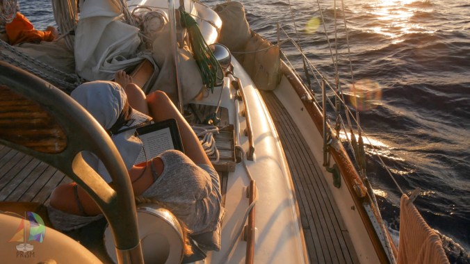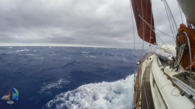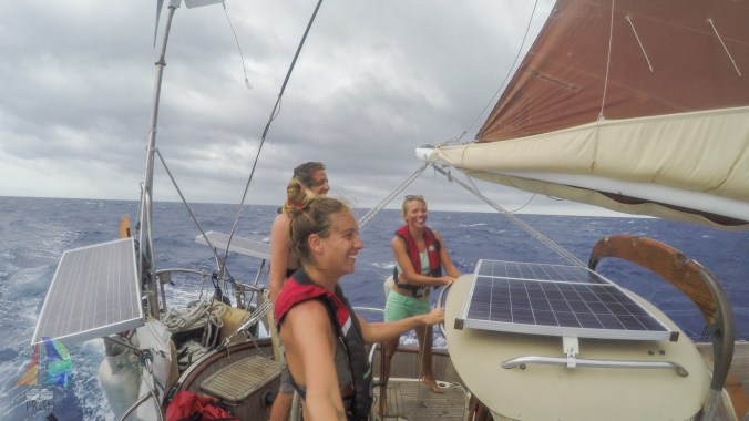 The 89 hours it took us to sail and motor the 405.3 NM was simple. We spent our days playing card games, napping, reading, blogging and hiding from the sun. On our last day we were dodging squalls left and right and thought we made it through without one hitting us…. that was till one turned around and came back for us. We saw it coming so we were prepared for the rush of wind. We lucked out that the squall \came from behind, so Prism just screamed along under a double reefed main for about 1.5 hours in 28-35 knots of wind. Jon stayed at the helm steering Prism down the building swell while Jet and I took pelting fresh cold showers then ducked down below till it passed. Easy.