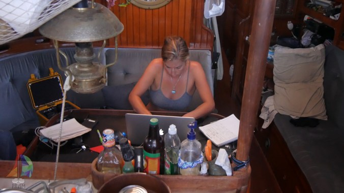 Shannon working on the Blog while underway