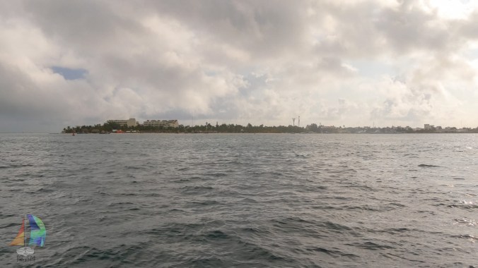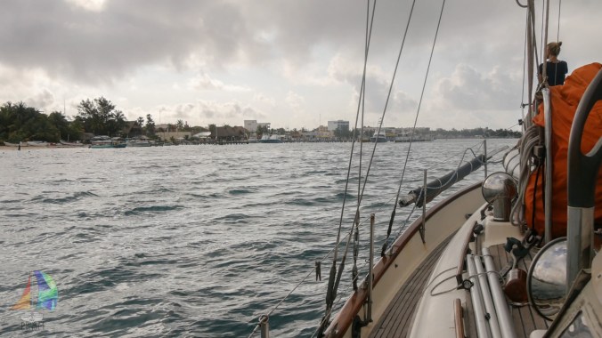 Jon hoisted the tri-sail just to help with the rolling in the swells as we pulled into Bahia Mujeres. The sky line rivaled Panama City’s and was back lit with a very nasty looking squall that we thought was going to hit at any moment. Of corse a squall would descend on us as we are entering a shallow unknown channel and harbor entrance.