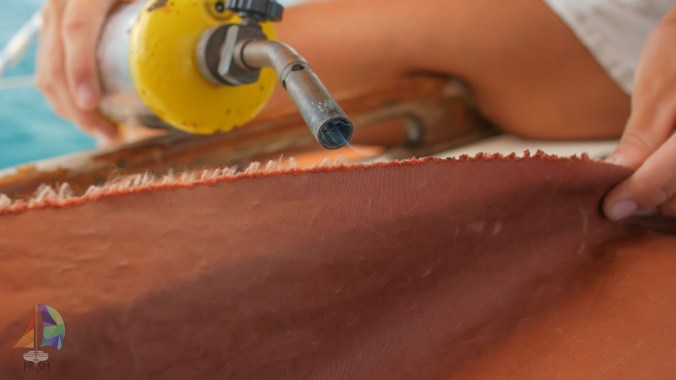 Burning the ripped edges of our main, prepping for the repair