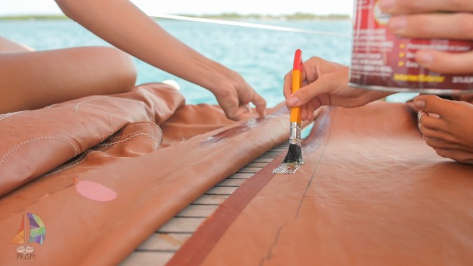 Shannon and Jet gluing the main along the ripped seem