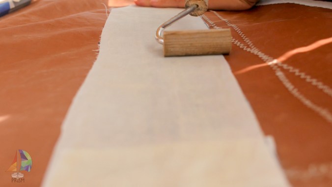 gluing the patch along the ripped seam and applying pressure with our makeshift pressure roller. It is very high-tech