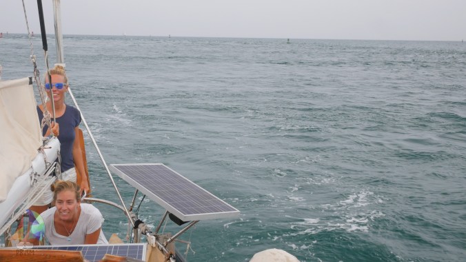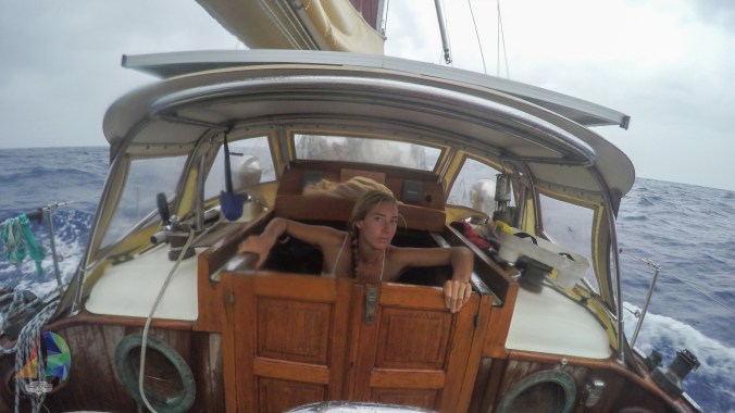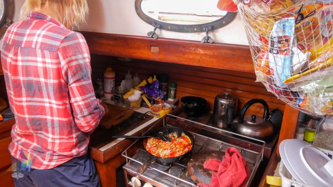 Anyways while all this talking way going on…. what we should have been doing was taking down sails, getting on our foul weather gear, life jackets and battening down the hatches. So before it hit we decided that not all 3 of us had to be out side and get wet, so I stayed down below to put dinner away and close the port lights.