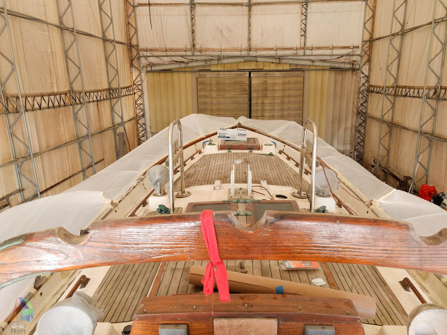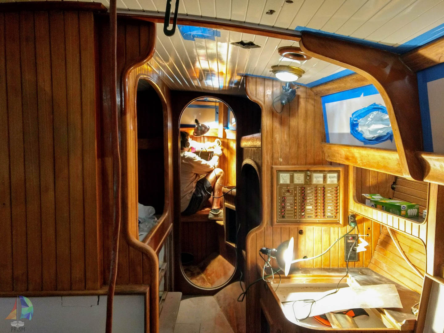With all our personal belongings off the boat, and our work tent all set up, Jon and I went right to work sanding and removing the old white paint inside all of Prism’s interior compartments. Basically if it was not teak then it was getting a new coat of paint.
