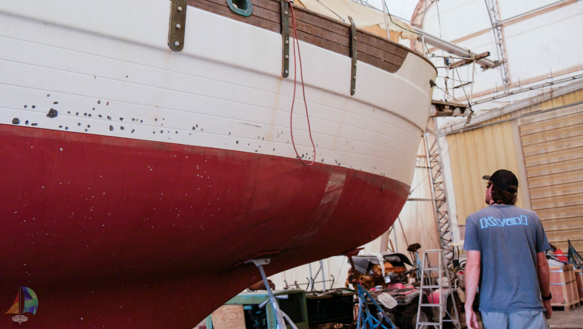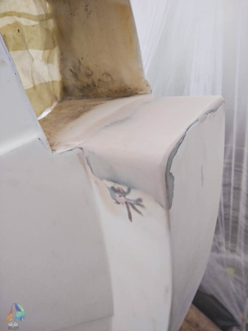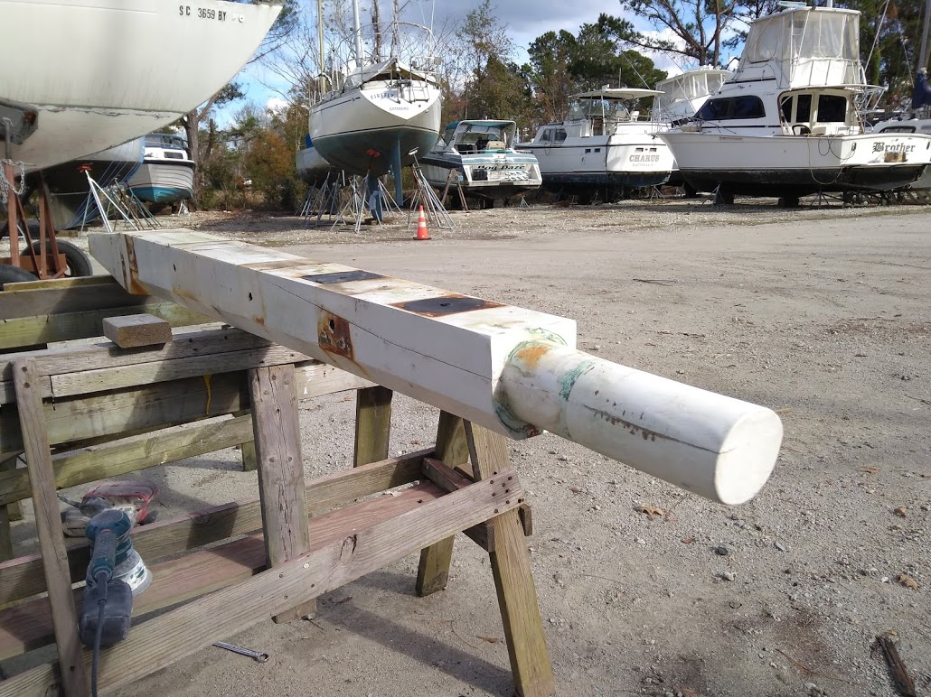 While I was applying coats on the interior Jon was working outside getting our rudder back into ship shape. When we left Prism back in 2017 we once again drilled holes into the rudder to hopefully dry it out. We did the same thing when we left her in Guaymas back in 2015, but the rudder filled with water again during our cruise through central america and up the east coast. After sitting here for 13 months the rudder was once again dry and needed more attention than we had given to it before. We cut out all the delaminated glass, laid up new 2 layers of 1708 along the bottom ledge and inside edges and then some.