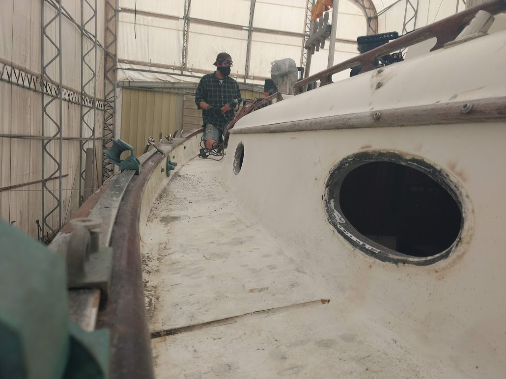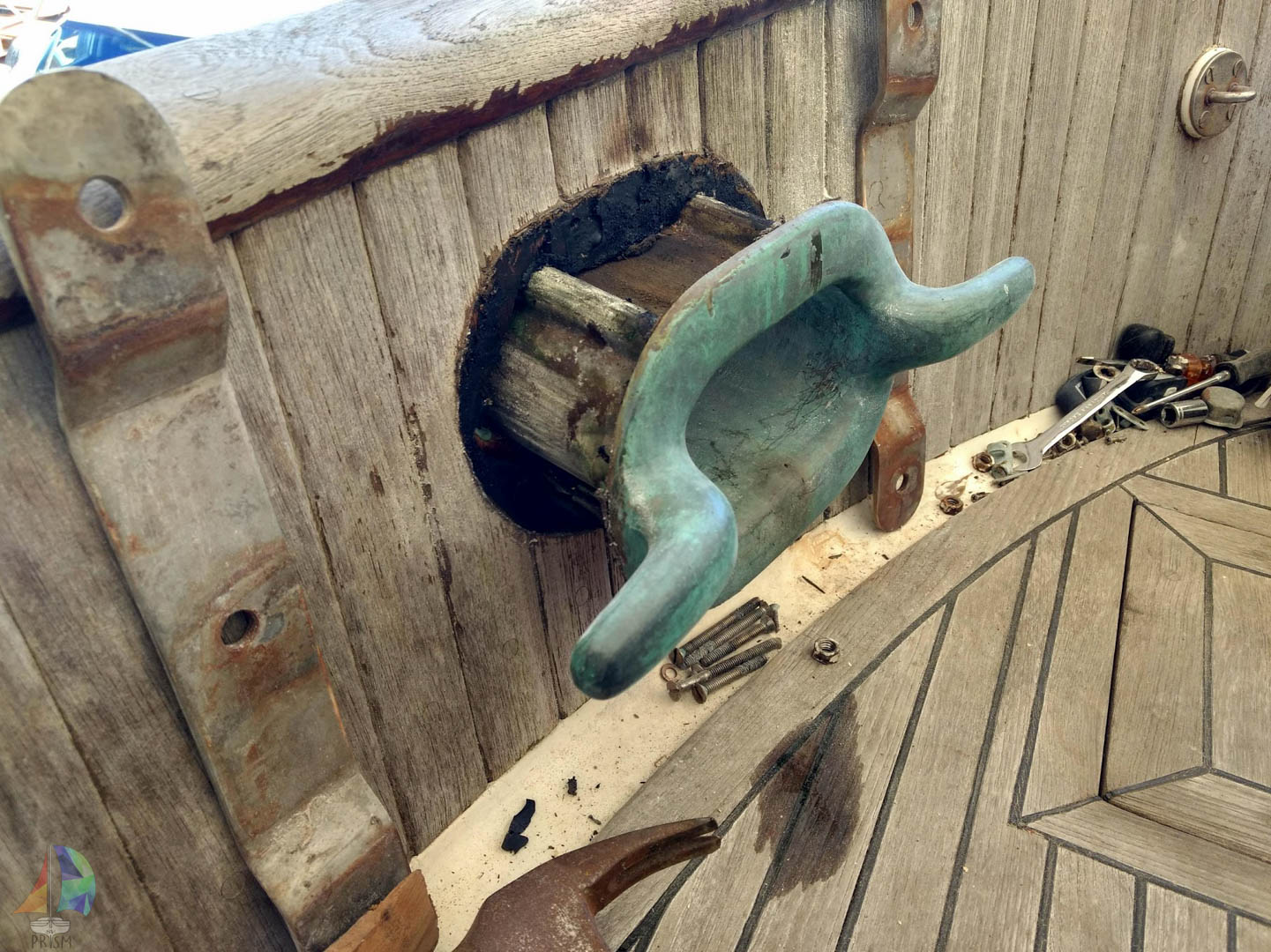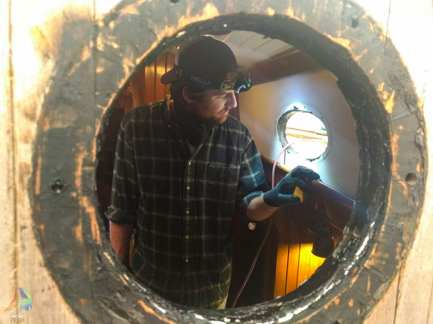 What we did not know, was that the same black goop was going to give us a run for our money when it came to removing it from all the crevices it had called home for the last 15 maybe even 30 years. This task took a verity of tools to complete, including the handy ol’ heat gun, scrapers, picks, dremels, sanders and good ole fashion elbow grease. All of this black goop had to be removed before we could continue because nothing will stick to it, thus creating perfect voids and problems when it comes to sealing the portlights back in place. Just let me say: PRISM Crew: 1, Black goop: 0