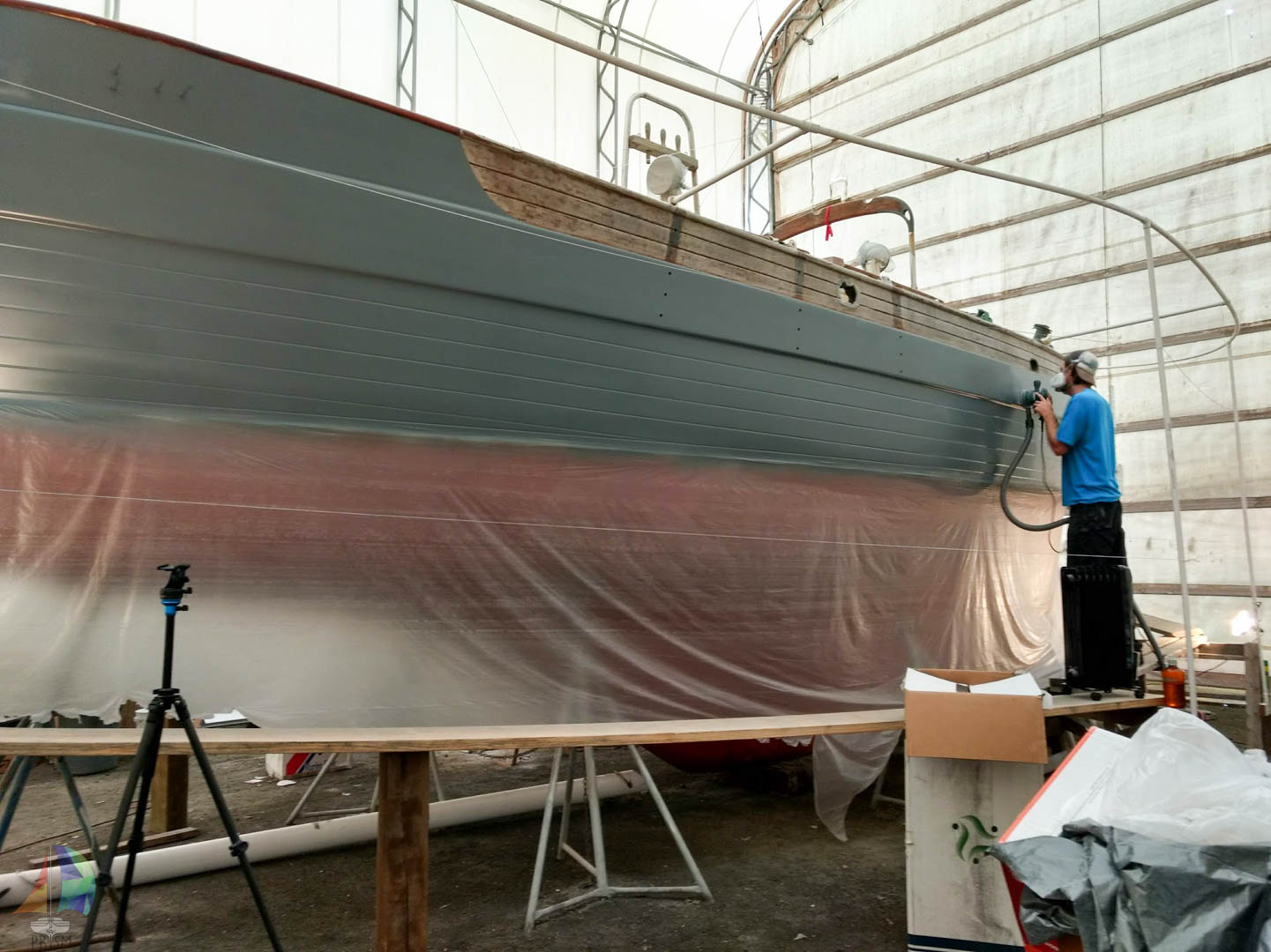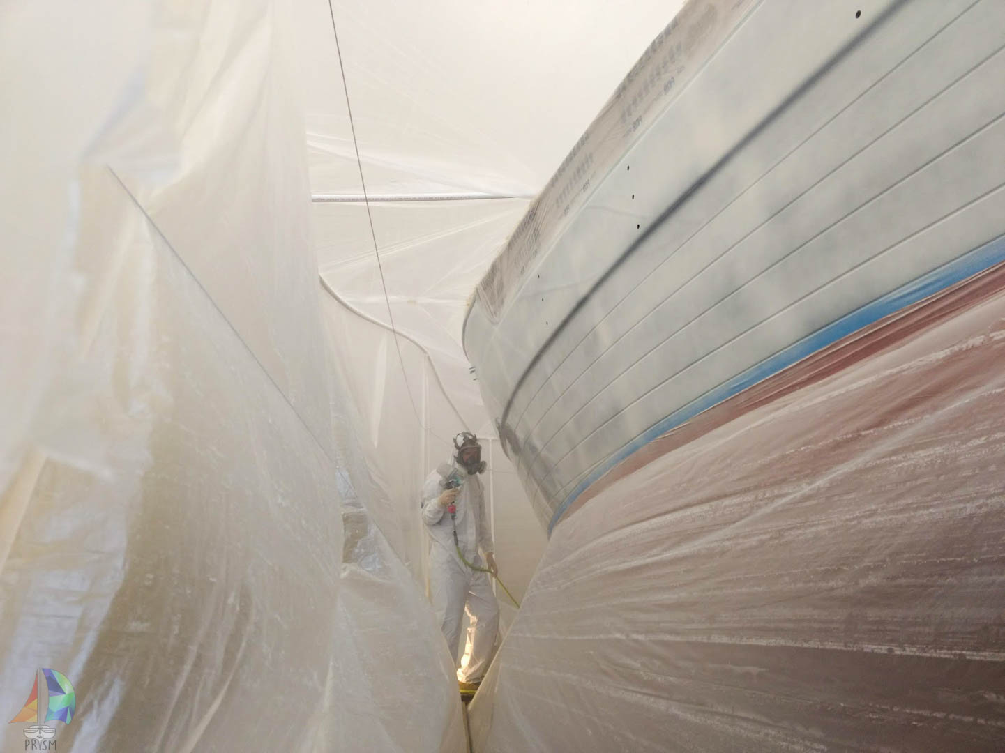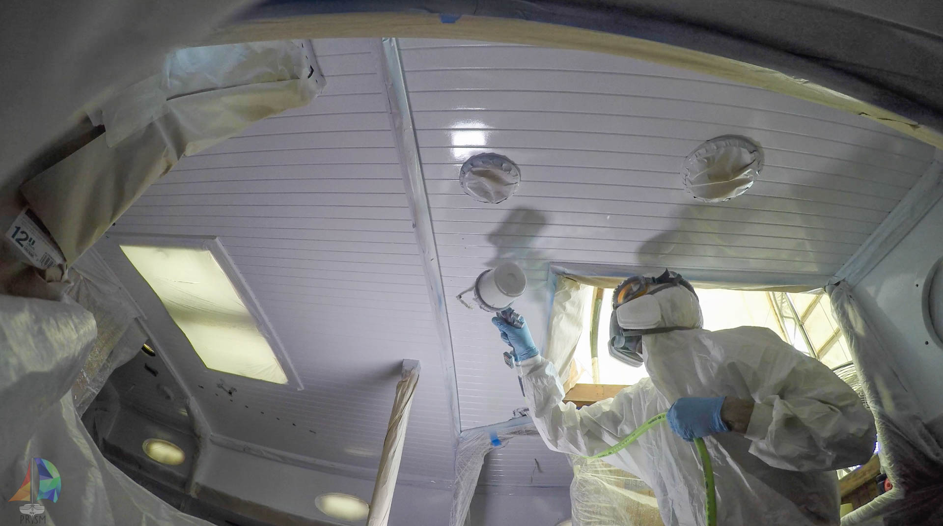 - Spray primer and Awl-grip (top coat) on topsides and cabin top
