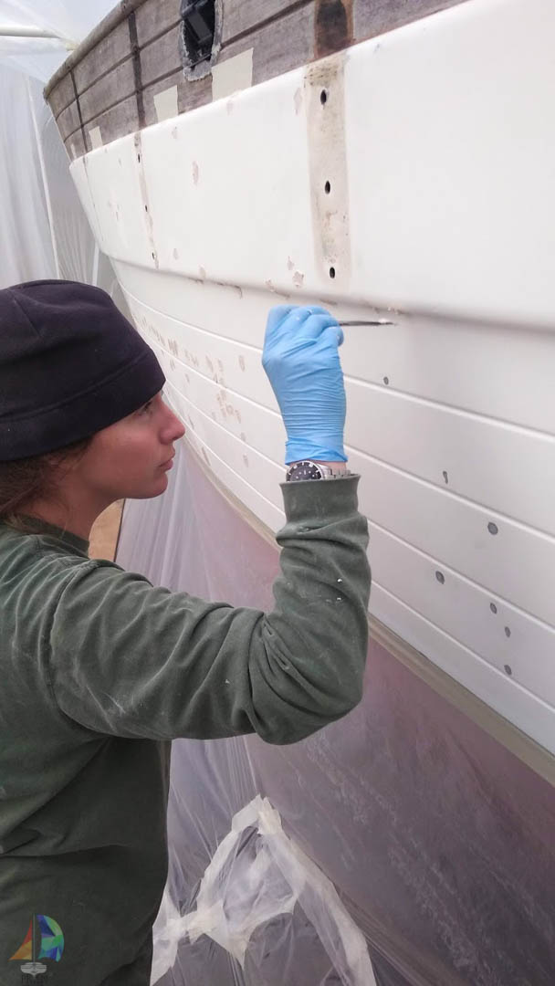 Jon, quick on his feet decided that it was because we did not get the Tuff Stuff as smooth as we thought. So we called a few more people with awlgrip spraying experience and they agreed with us, once we told them about our Spackle job with the Tuff Stuff. That mistake was still haunting us. Jon had a plan, we would clean the areas where the pin holes were and then carefully, with a small art brush, fill the holes with paint. Worst case scenario it didn’t work and we would have to sand it all back down and start over. Best case it would fill in the pin holes allowing us to sand the topsides just enough to give it a tooth and apply new coats on top. So we went for it, wished for it to work and went home.
