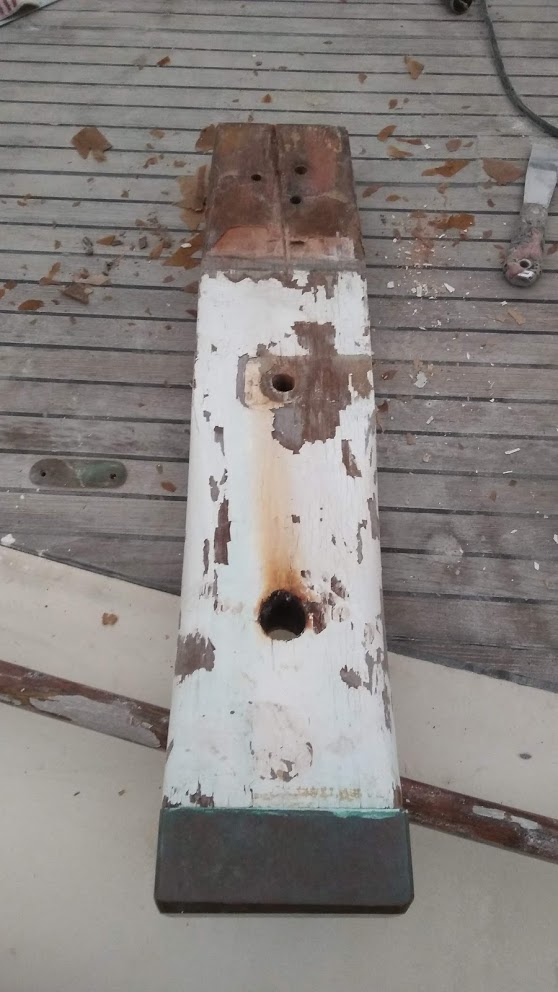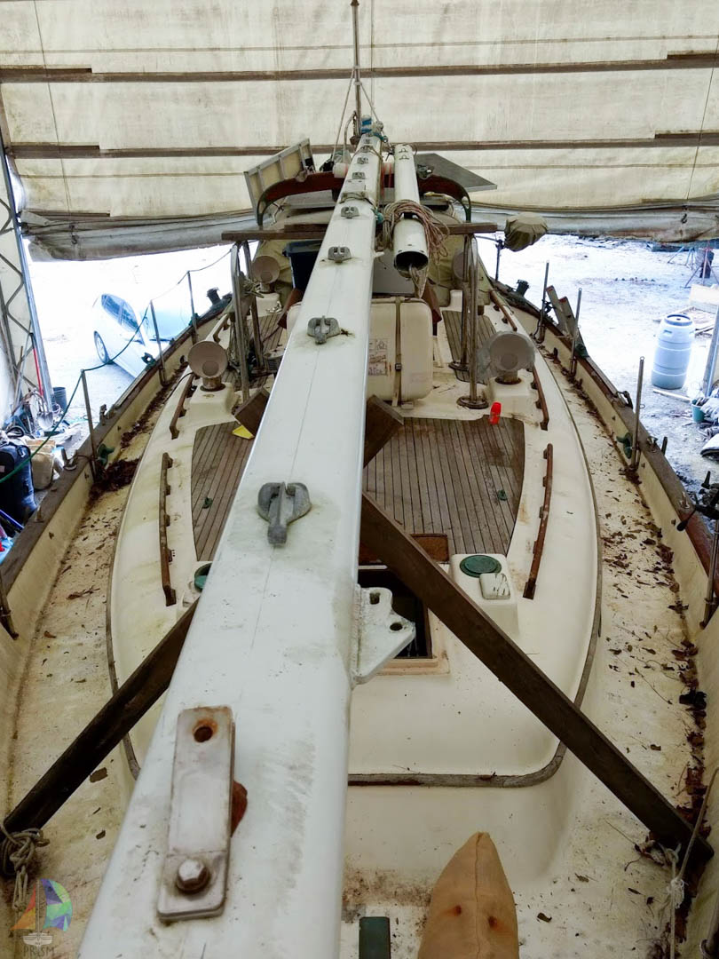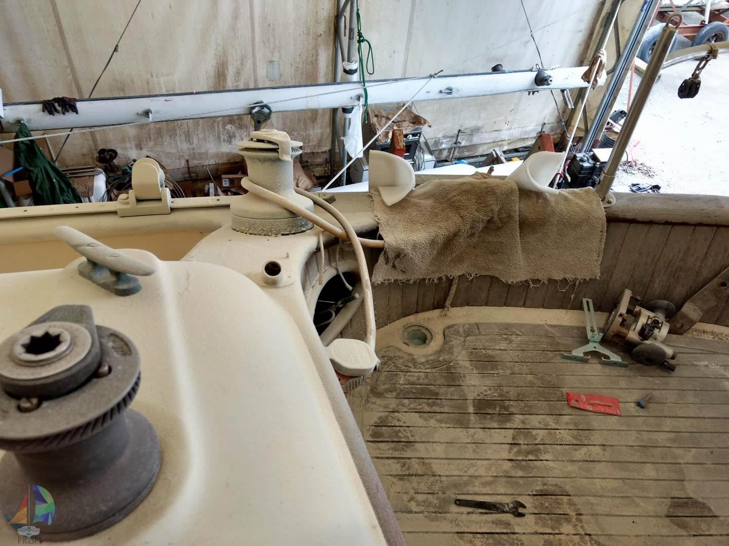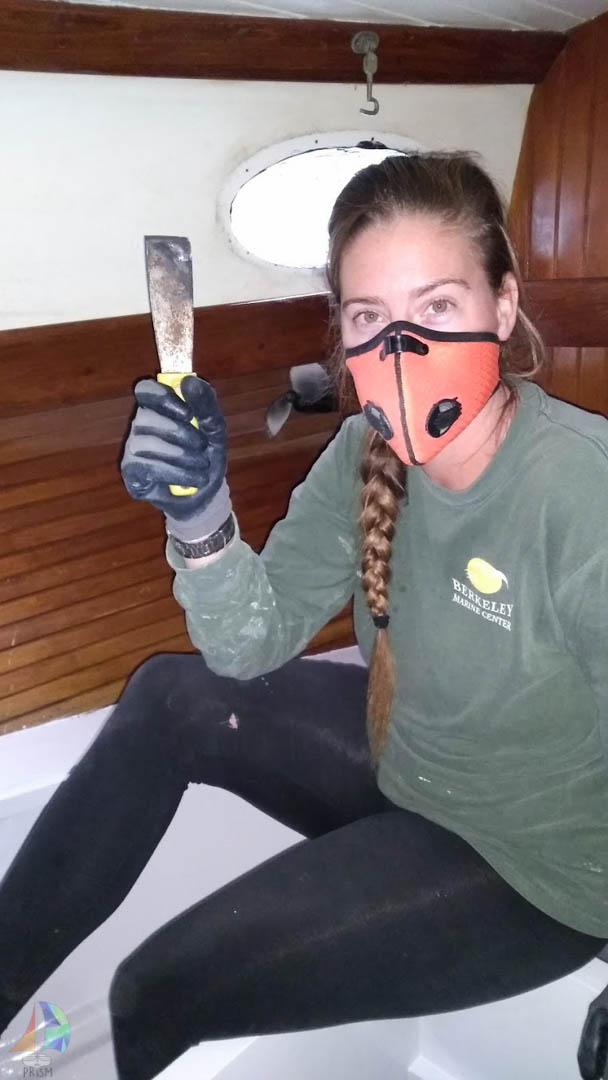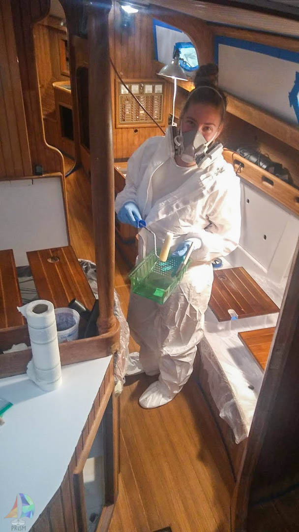 The paint which was applied at some point in Prism’s past has been failing for years. Jon and I have bitched about the yellowing flaking paint for years and it was not a simple task getting it prepped. Getting into all the nooks and crannies involved some serious boat yoga and a lot of cuss words.