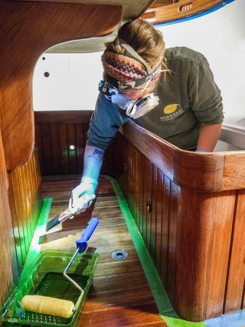 This time it was my turn to get suited up. Jon did the final vacuum and wipe down while I started to mix the primer and allow 10 minutes for the product to decanter. Using a roller and a foam brush, I rolled and tipped the Awlwood primer on our cabin sole, working from the head backwards towards the galley where I could/ would climb out without touching the floor. Good thing I am kind of a monkey. I finished the coat with perfect timing. The next morning we would be within the 18 hours with enough time to sand and prep for the next layer.
