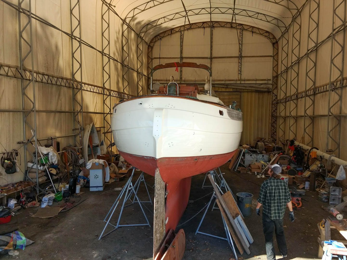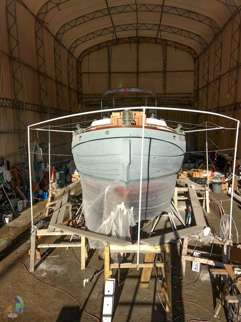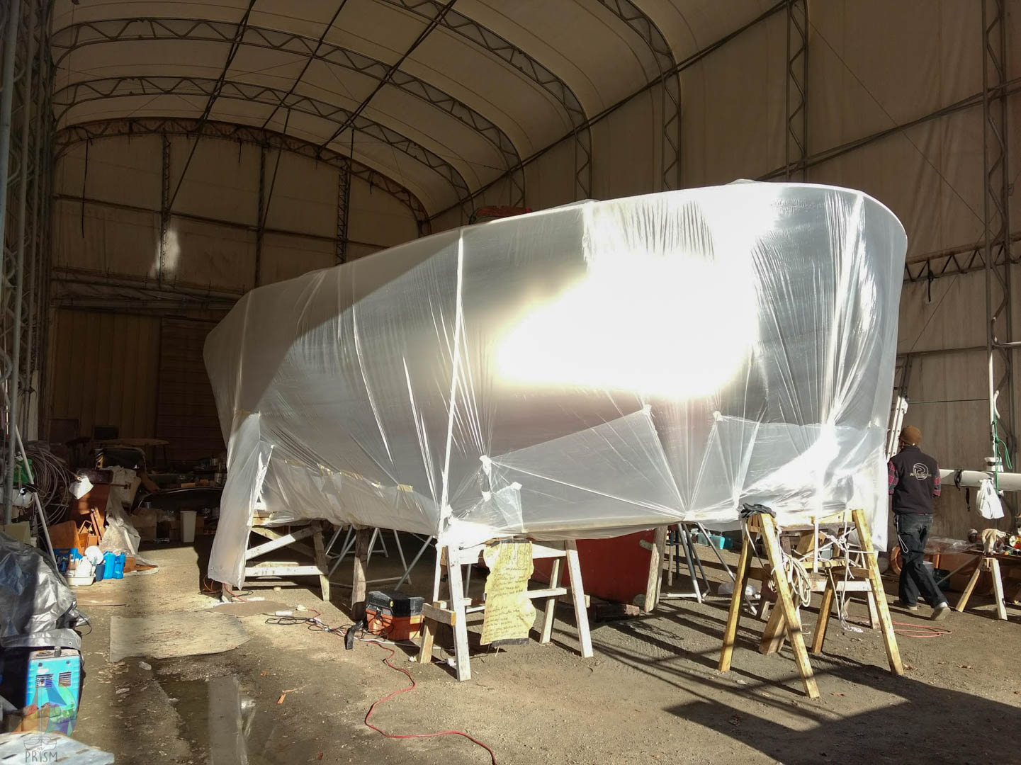 While the epoxy and glue were drying in the galley we started to sand the 545 primer. First we took down the plastic bubble as we were going to have to re-drape it before the final topcoat, but it gave us a real good look at Prism from afar and not gonna lie, the dark grey was a very cool look on our boat. If we were not planning on sailing in the tropics so much, I think I would have loved to have her that color. But dark hulls are hot, show every scratch and are hard to keep clean ( like a black car vs a white car).