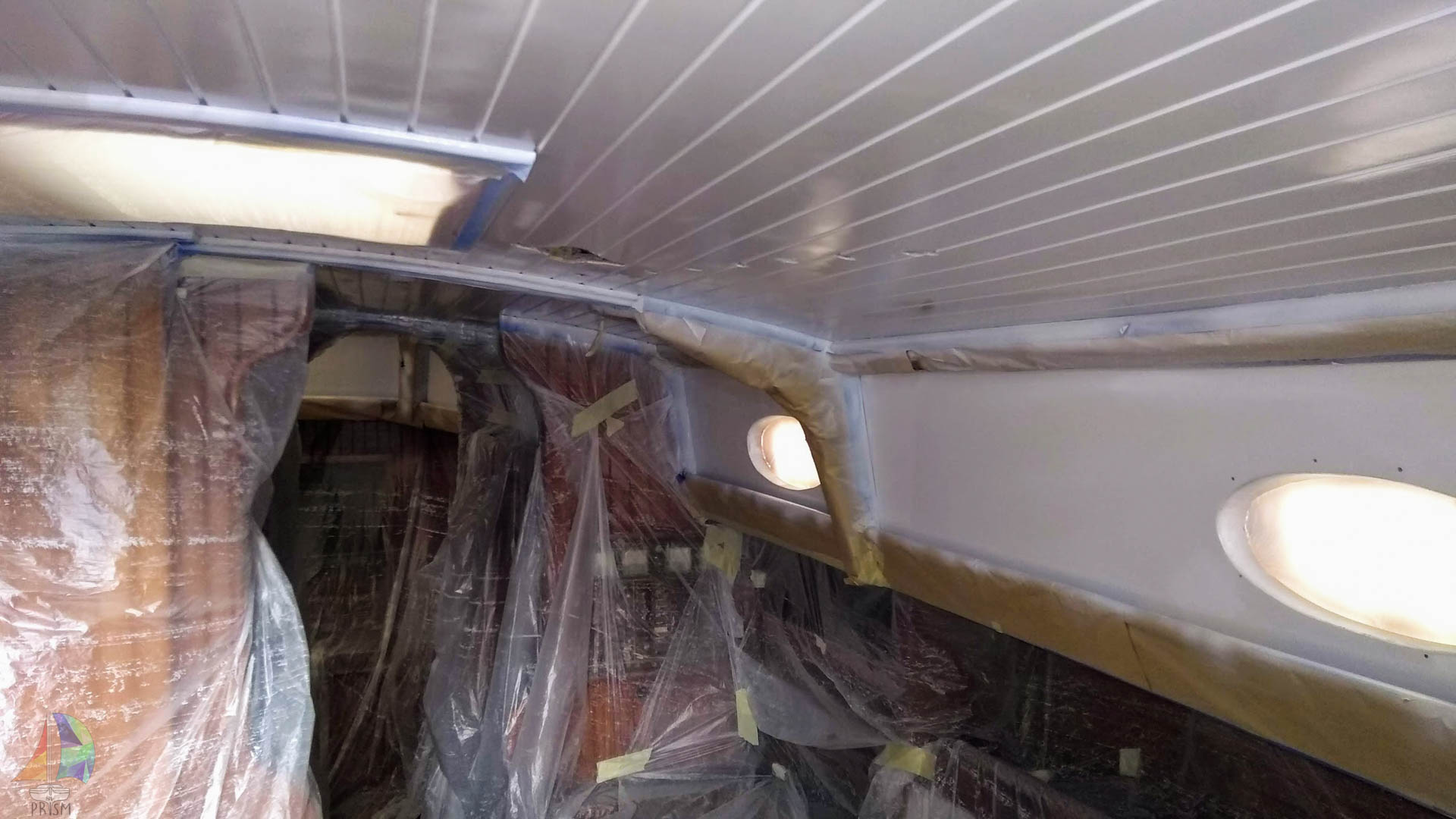 Now that we were free from the black goop we needed to address the cracks and countless holes in the laminate and headliner. We filled in the cracks and holes with thickened epoxy and west systems and 410 filler. (looking back now, we probably should have just used a filler like bondo to allow more flex, oh well) Once we had solid, smooth surfaces once again we were almost ready to start spraying the new gloss white interior, but first we needed to make some adjustments to the 2 most forward portlights.