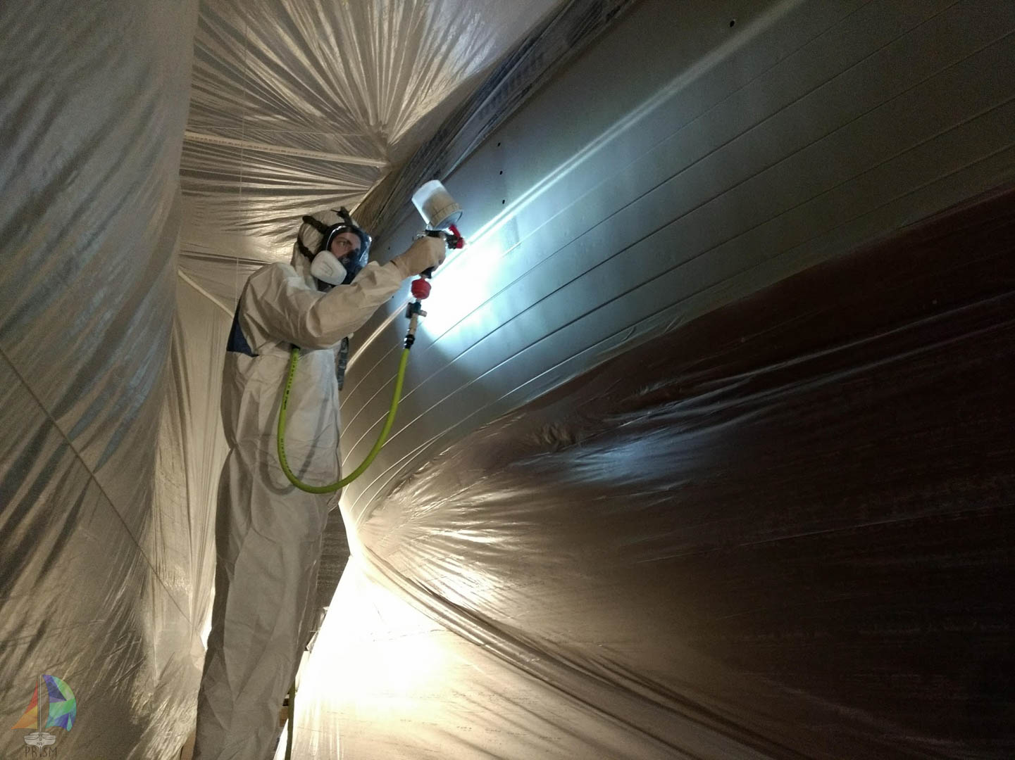 We worked 12 to 14 hour days and felt like we were making real good progress with the interior paint. We also removed all the panels which give us access to all our lockers/ compartments to be prepped and painted. These removable items were brought downstairs and hung up like drying laundry to be spray painted with the new 3M accuspray gun set up we bought.