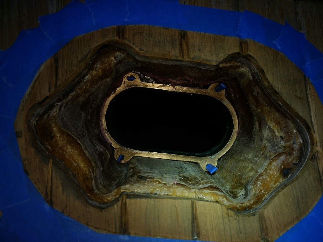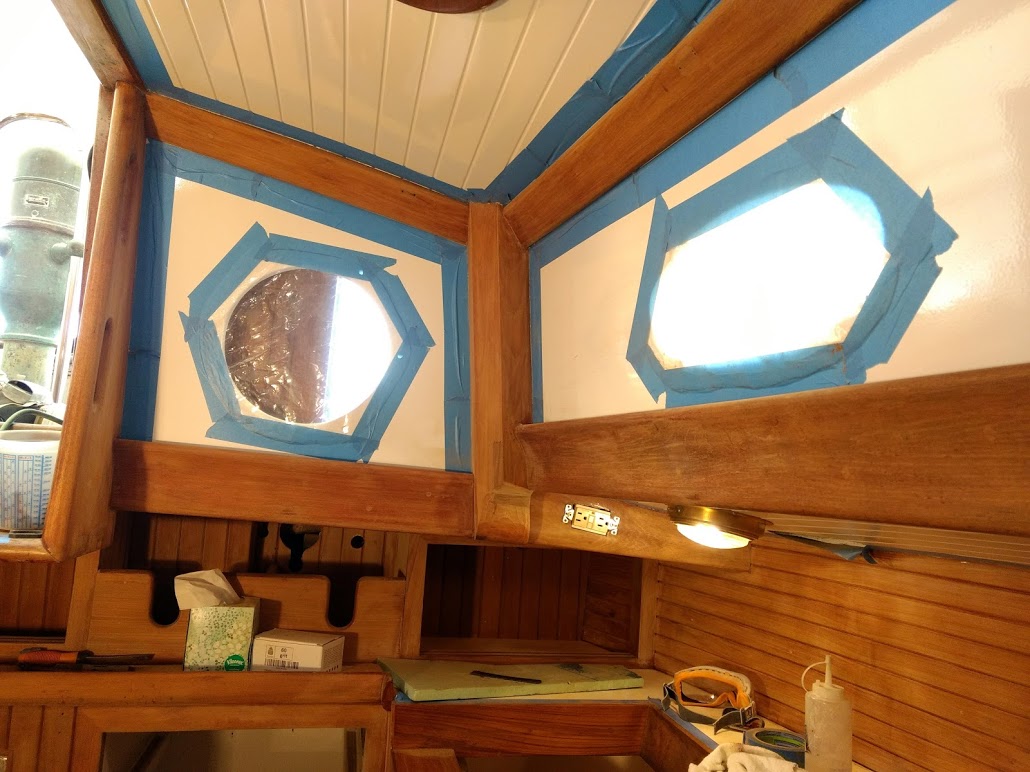 We assume that these 2 portlights have always been problem children as the holes they lived in where way out of shape. So to fill in the void and correct the shape we lubed up our portlights with Vaseline, placed them into the hole and filled in the voids with thickened epoxy. We let the epoxy cure just enough to the point it was hard, but still soft enough to pull the portlight out leaving a perfect fitting hole. The portlight that lives in in the pullman berth needed the most amount of love, requiring an almost 1″ extension to accommodate the bend in the doghouse. We are not sure why only 2 out of the 10 portlights needed this kind of adjustment.