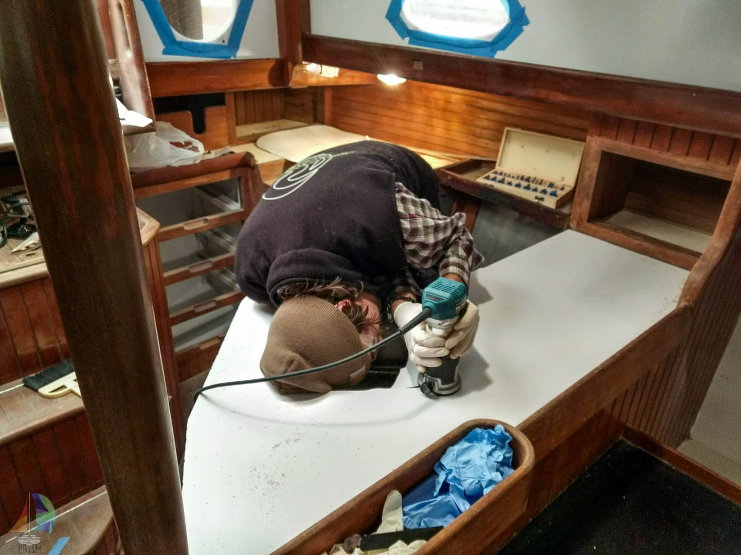 With another place to live, Jon and I set into full varnish mode. Before we could start applying the ACE spar we needed to address a few of the larger holes in our bulkheads and what not. So using some of the teak off of “Black Tie” aka US DIVE BOAT #1 which was about to be scrapped in the next few days, Jon was able to match up the grain and set in perfect fills. The next task would be the difficult part, routing out the grooves that make up our tongue and groove interior. Jon did this all free hand. With the router he took his time and routed out each groove matching up perfectly.