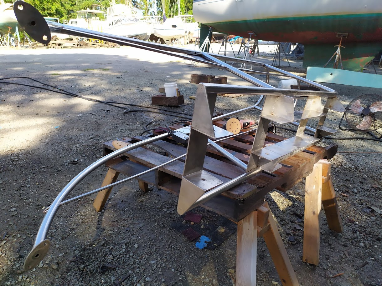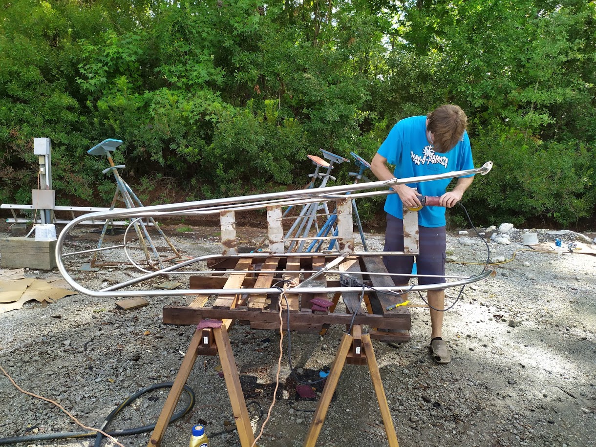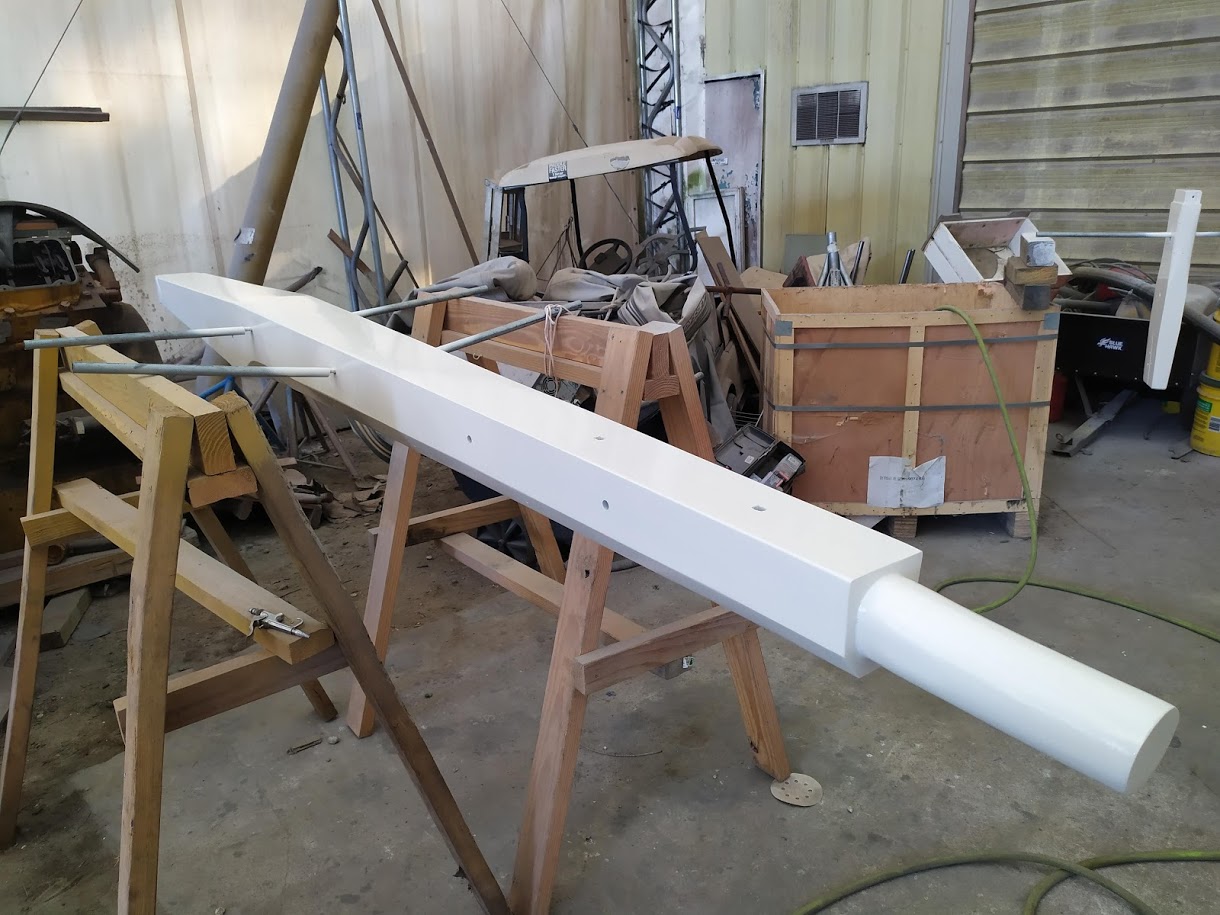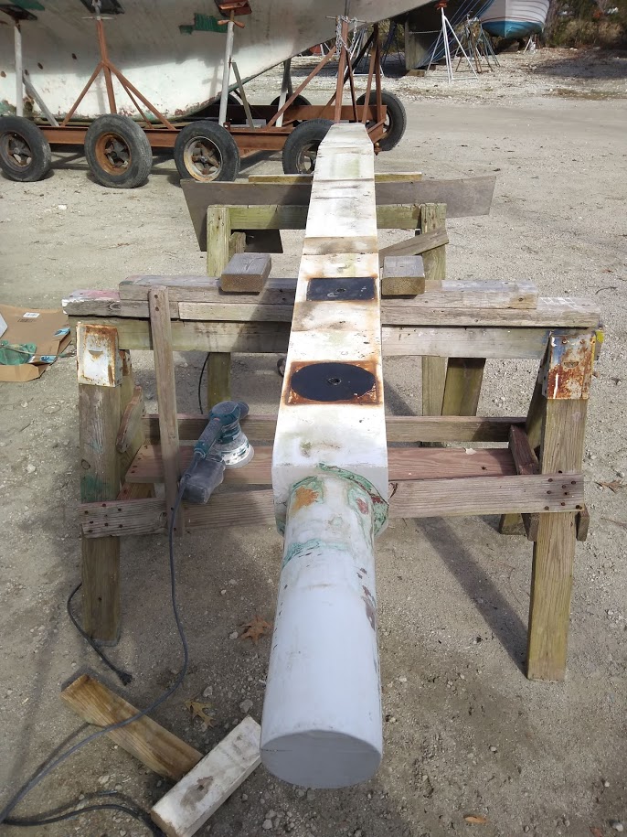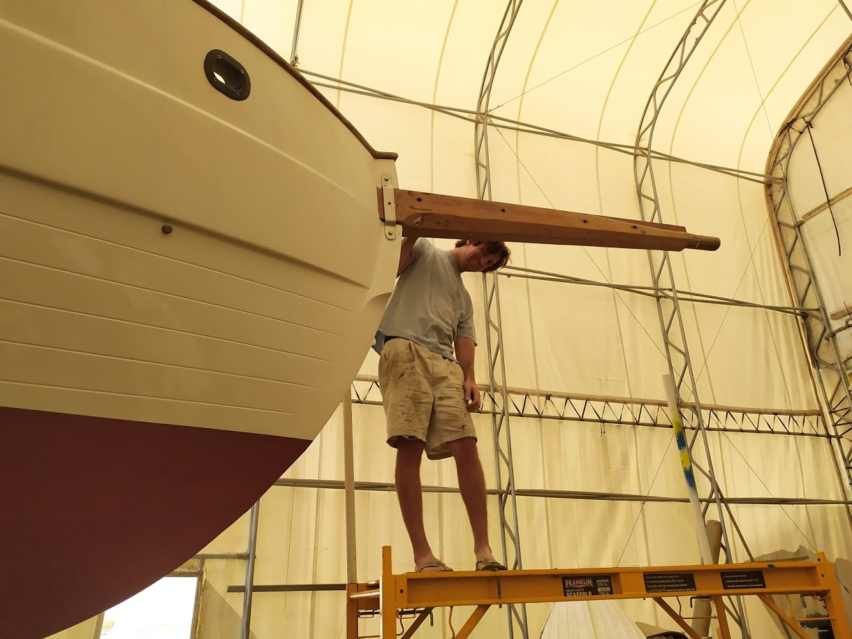 The next part of the the puzzle was to build our new boom. The boom is essential to raising our tabernacle mast because it is used as a lever arm to get a better angle to pull the top of the mast up. We had received our new boom nearly 8 months prior and had been storing it, waiting for the day we needed it. Once we found all of the parts to put it back together, it fell upon Jon to cut it to length to match the old boom. He didn’t want to go too short or we could possibly run into issues with our new mainsail not fitting and if it were too long it would not clear the backstay when tacking or jibing. It was imperative to get it right. After lot of measurements he took the angle grinder to one side of it and then riveted the boom ends together. According to his measurements it looked like it was perfect but we wouldn’t know until it was installed and the mast was up. He also had to retrofit the gooseneck to work with the new forward boom end. He ended up making spacer bushings using our drill press and 1” delrin stock.