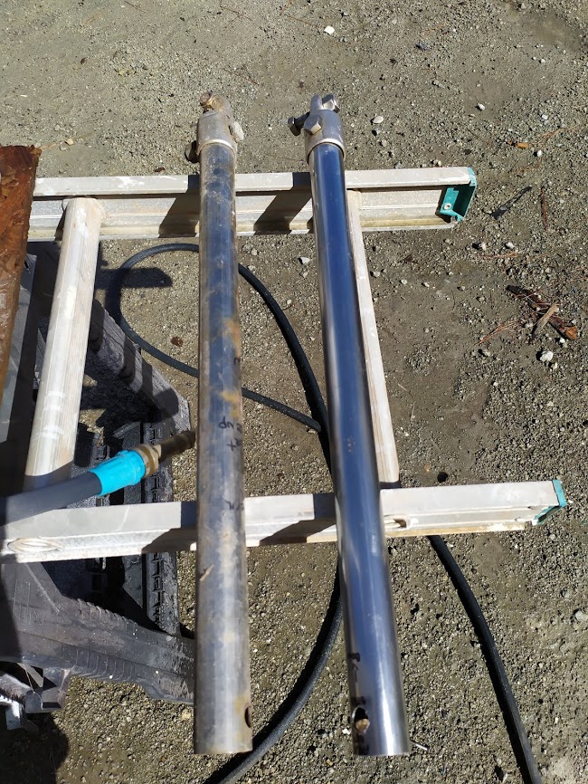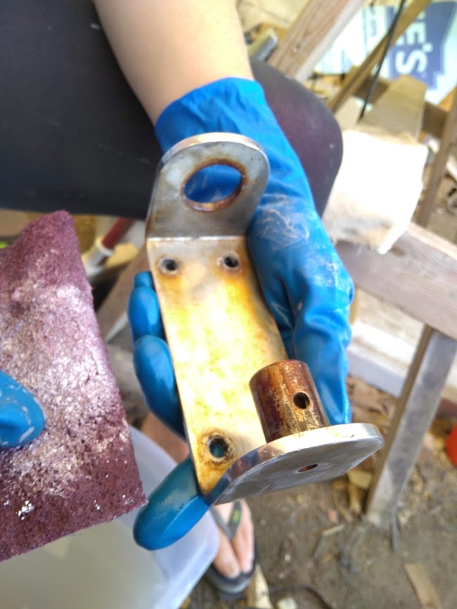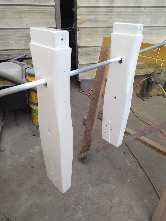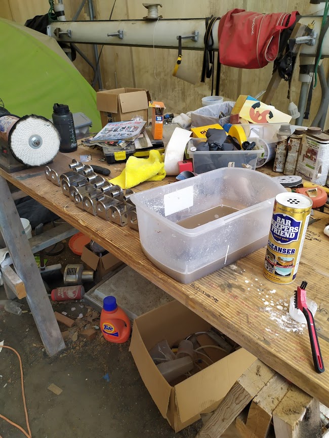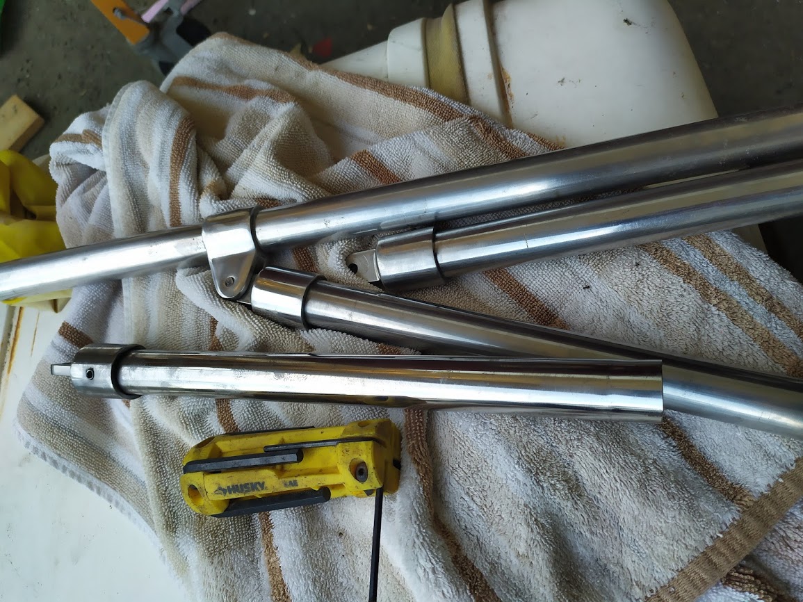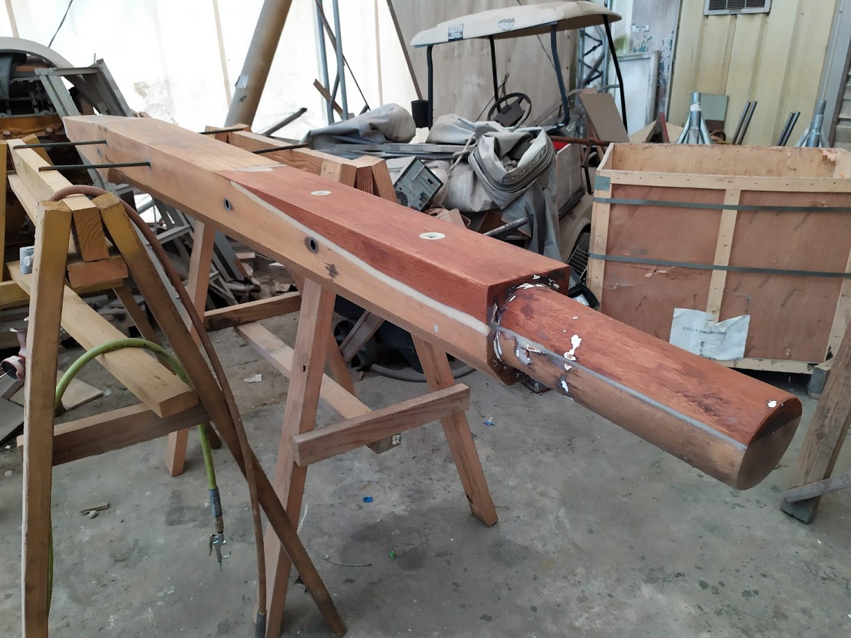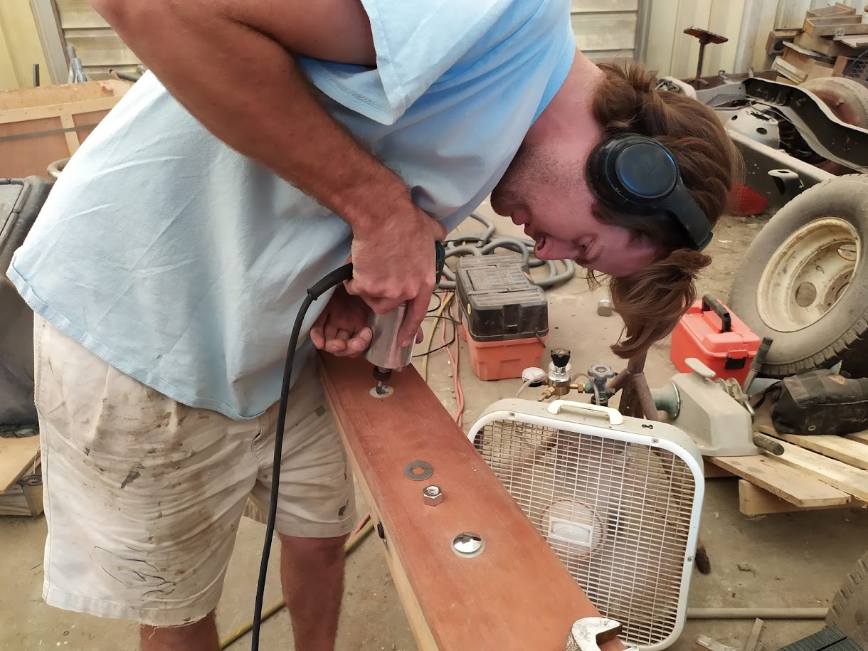 The next part of the the puzzle was to build our new boom. The boom is essential to raising our tabernacle mast because it is used as a lever arm to get a better angle to pull the top of the mast up. We had received our new boom nearly 8 months prior and had been storing it, waiting for the day we needed it. Once we found all of the parts to put it back together, it fell upon Jon to cut it to length to match the old boom. He didn’t want to go too short or we could possibly run into issues with our new mainsail not fitting and if it were too long it would not clear the backstay when tacking or jibing. It was imperative to get it right. After lot of measurements he took the angle grinder to one side of it and then riveted the boom ends together. According to his measurements it looked like it was perfect but we wouldn’t know until it was installed and the mast was up. He also had to retrofit the gooseneck to work with the new forward boom end. He ended up making spacer bushings using our drill press and 1” delrin stock.