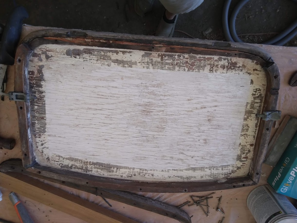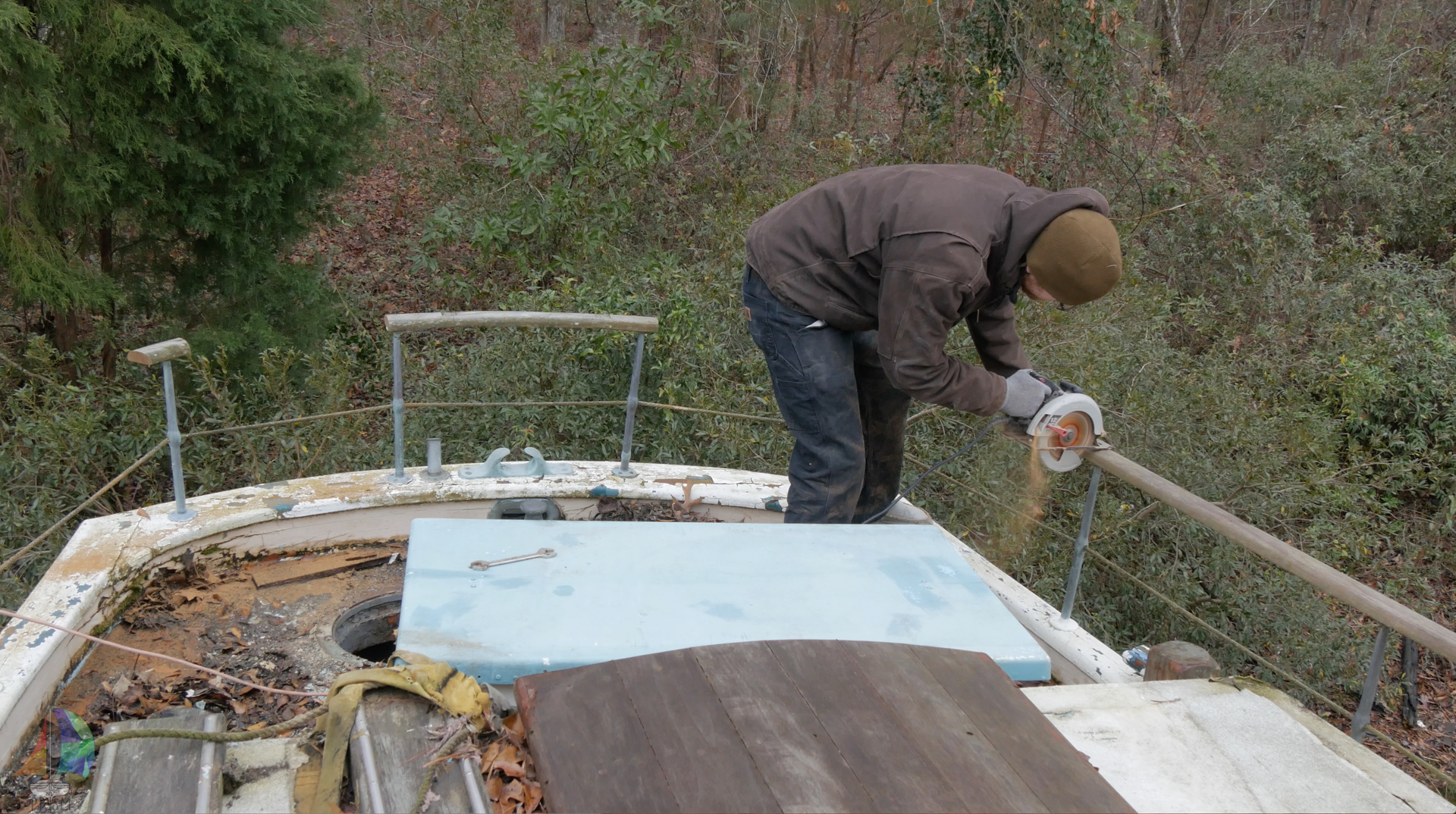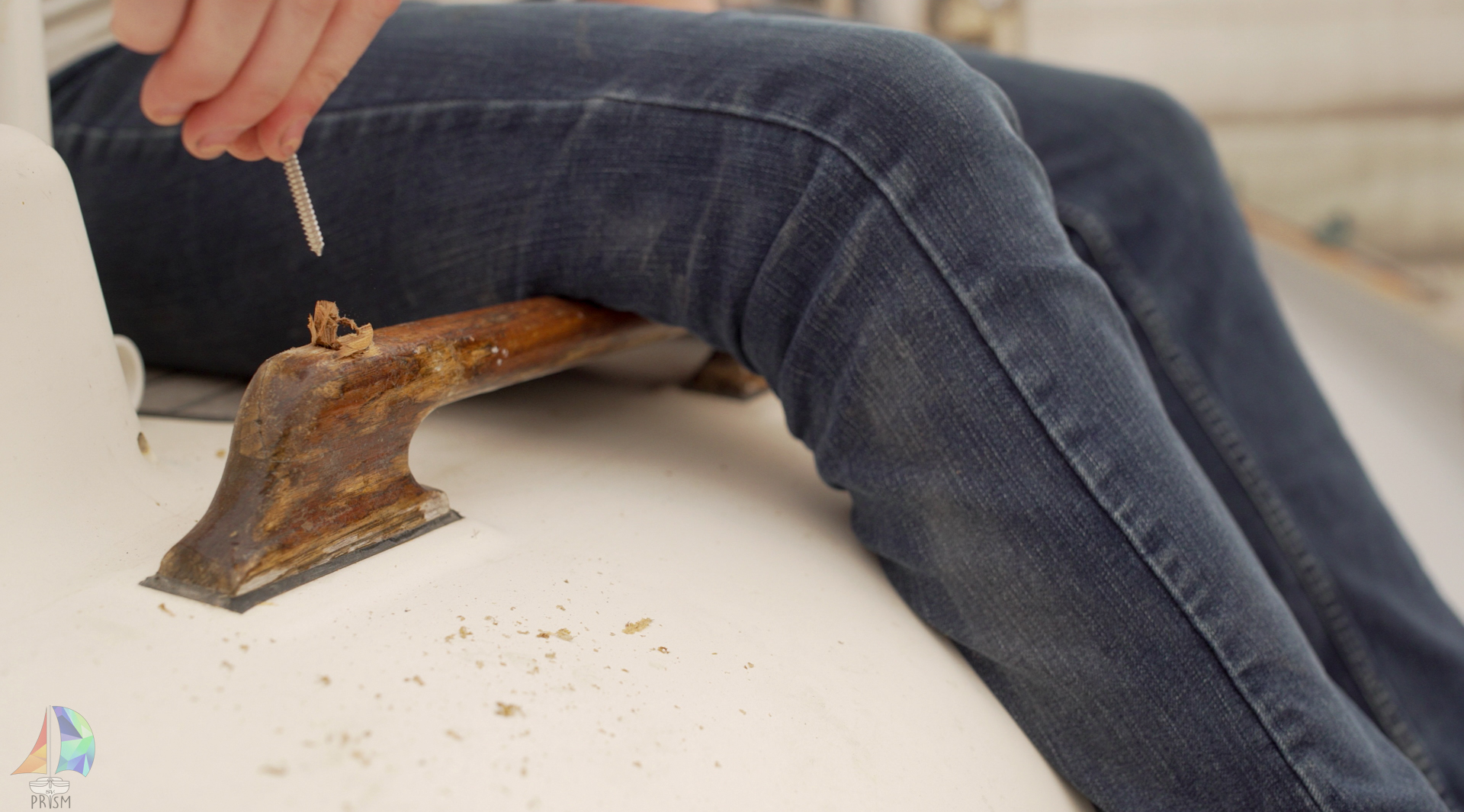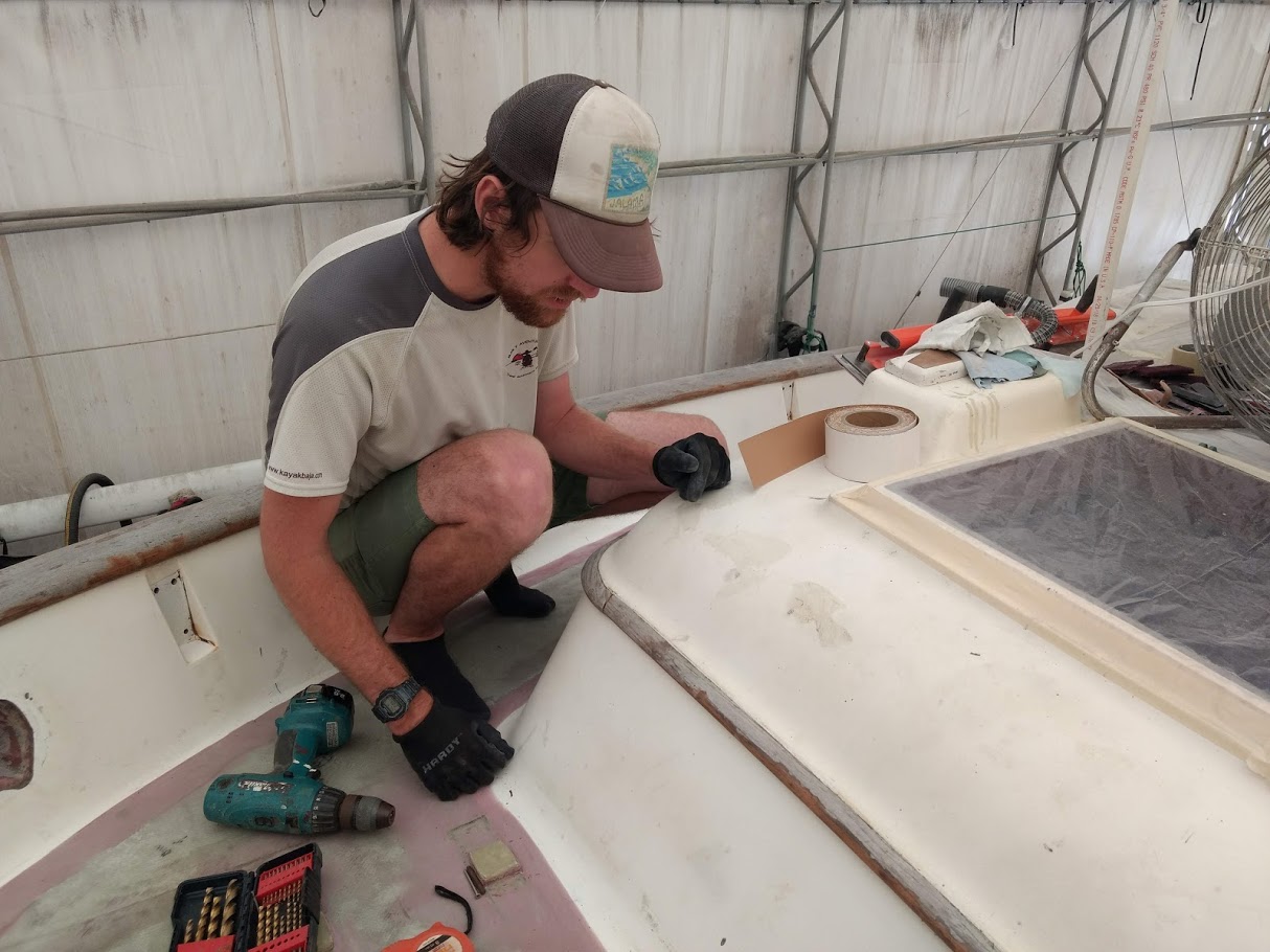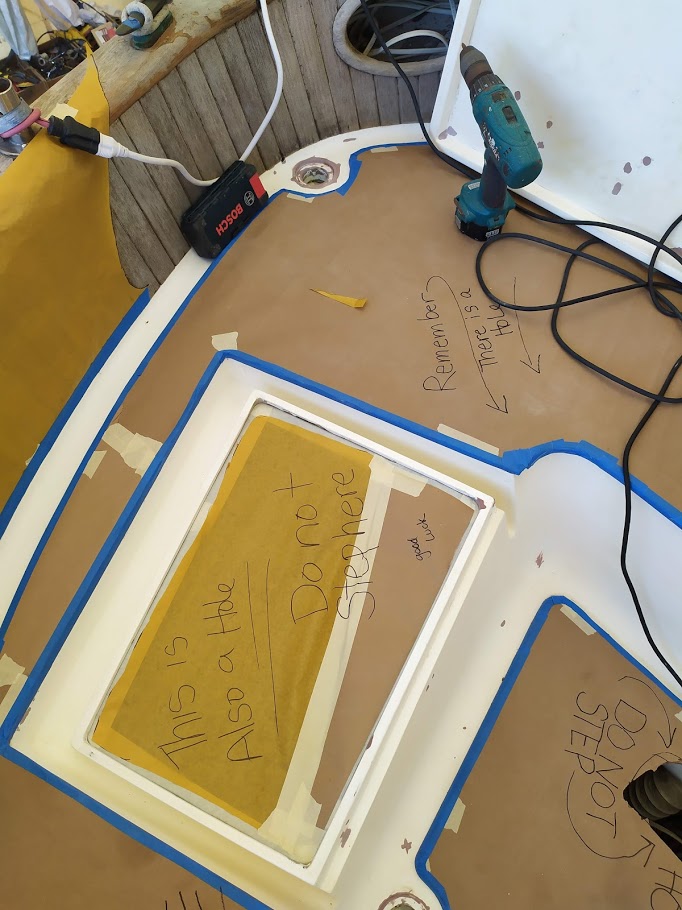 Removing hardware on the cabin top after decks were primed