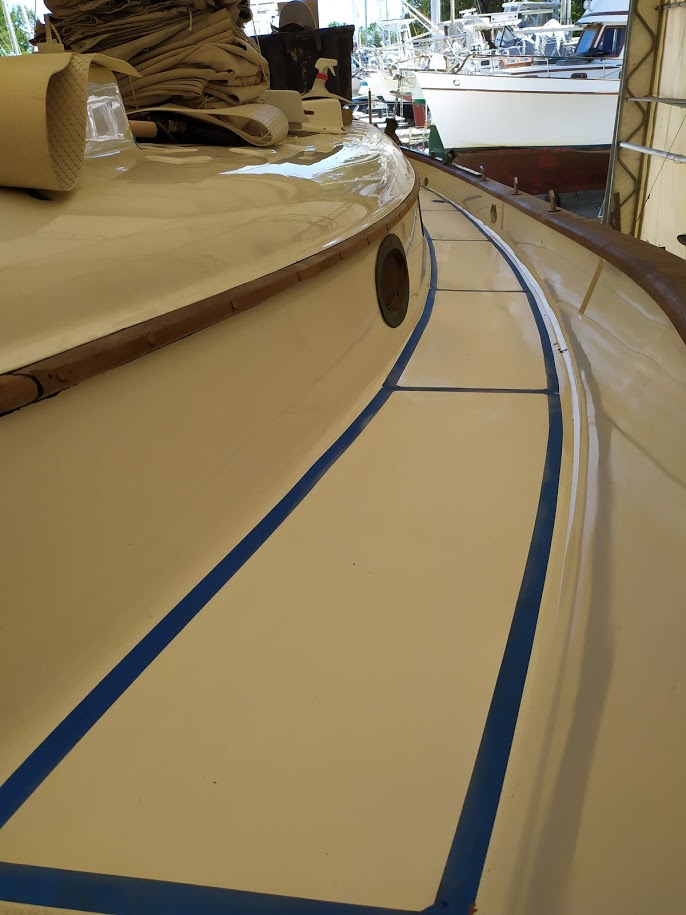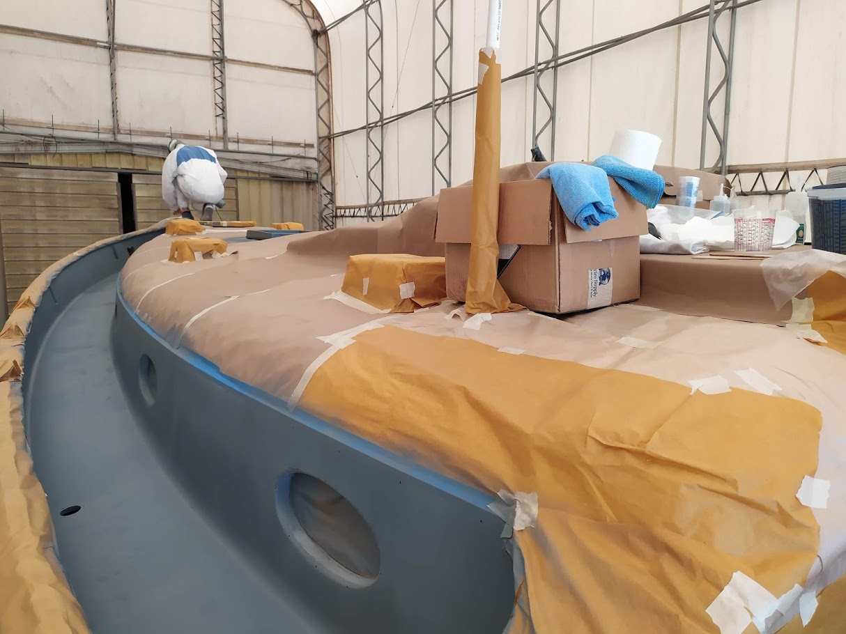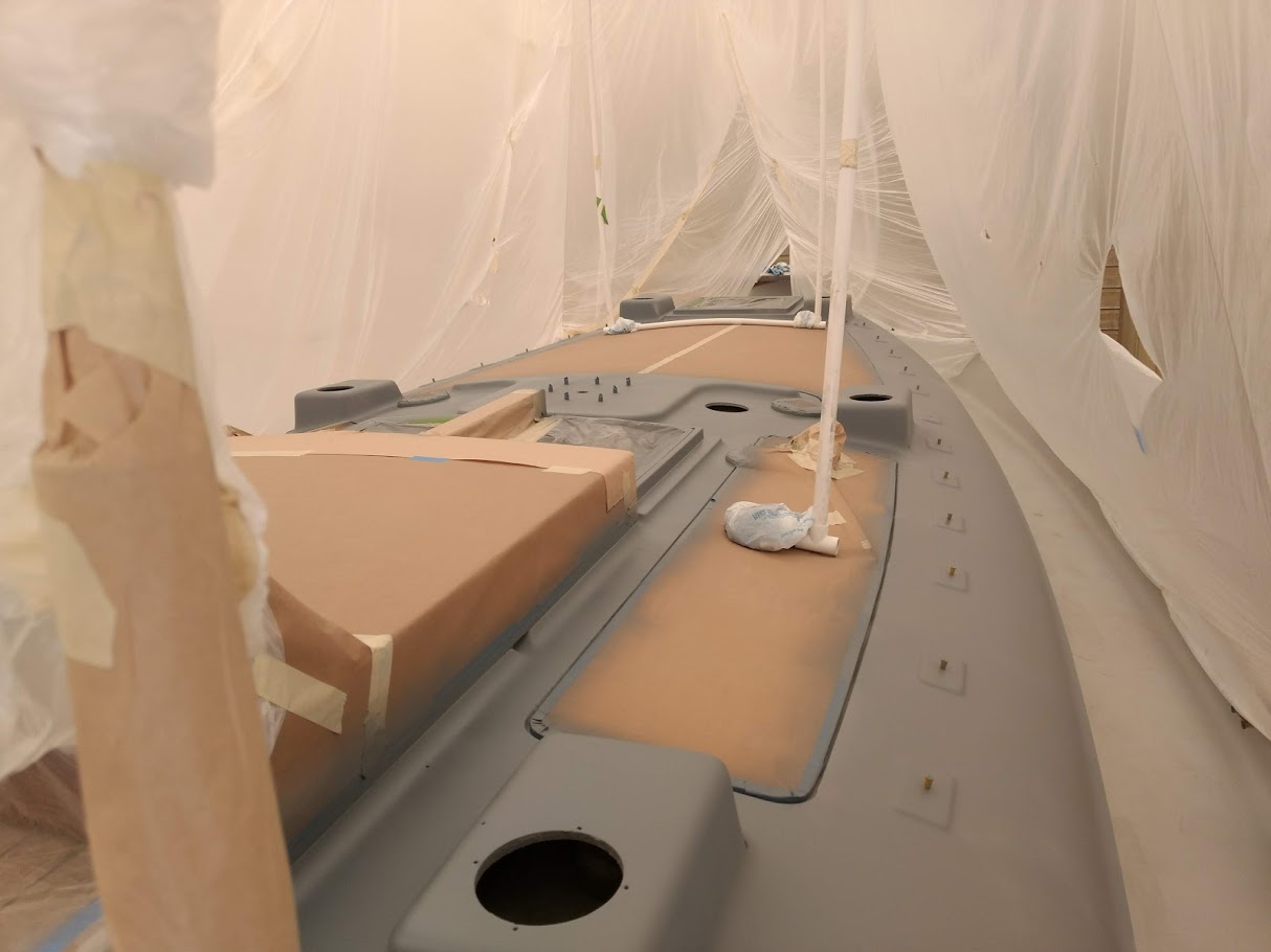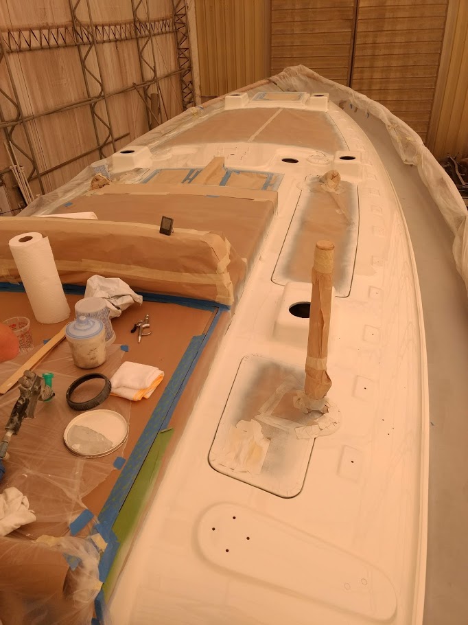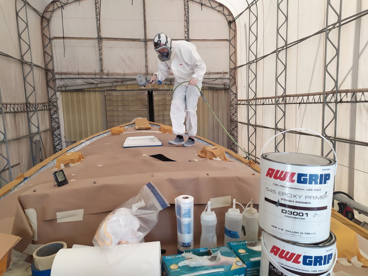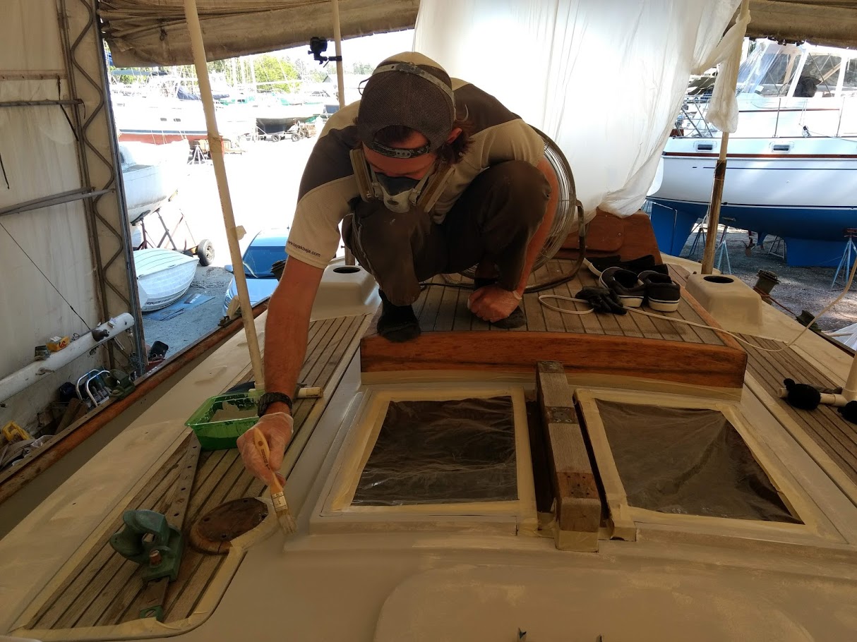 First up, figuring out the game plan of how we were going to paint the decks and cabin top without stepping on, in or around the previous coat. We knew we were going to have to do it in 2 stages and decided to use the eyebrow as the connection point between the cabin top and the deck. With this new game plan set in motion, we jumped right into getting the decks prepped and ready for barrier coat as we wanted to have that done before moving onto the cabin top.