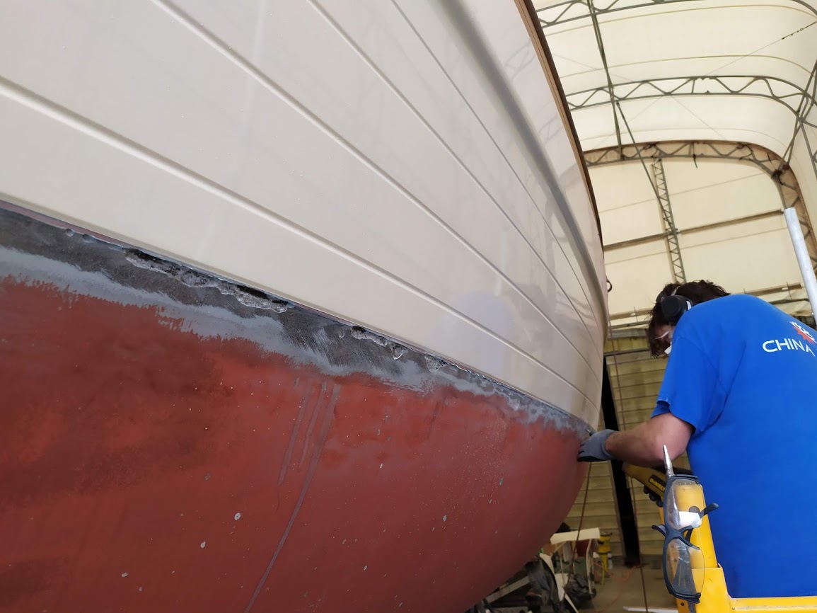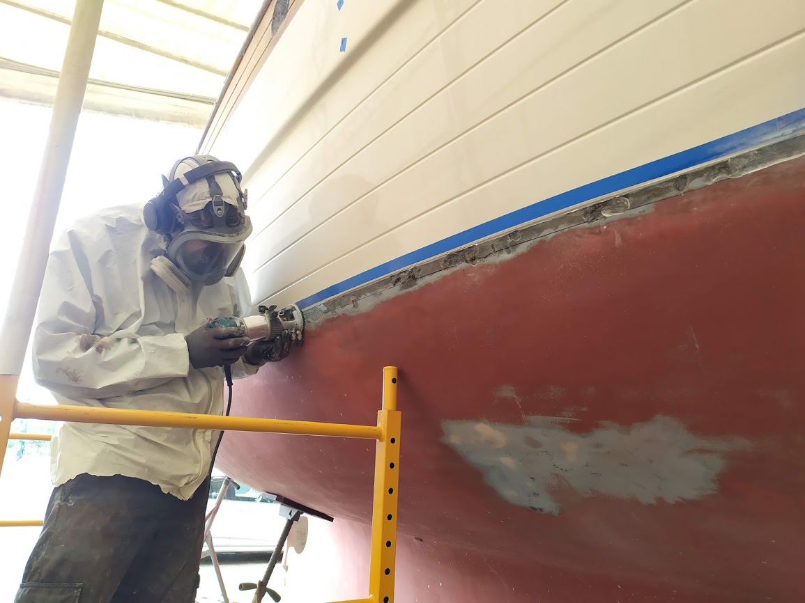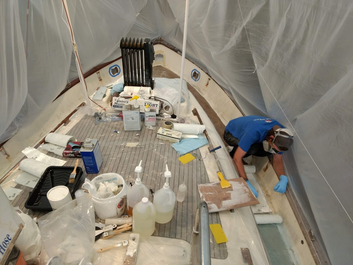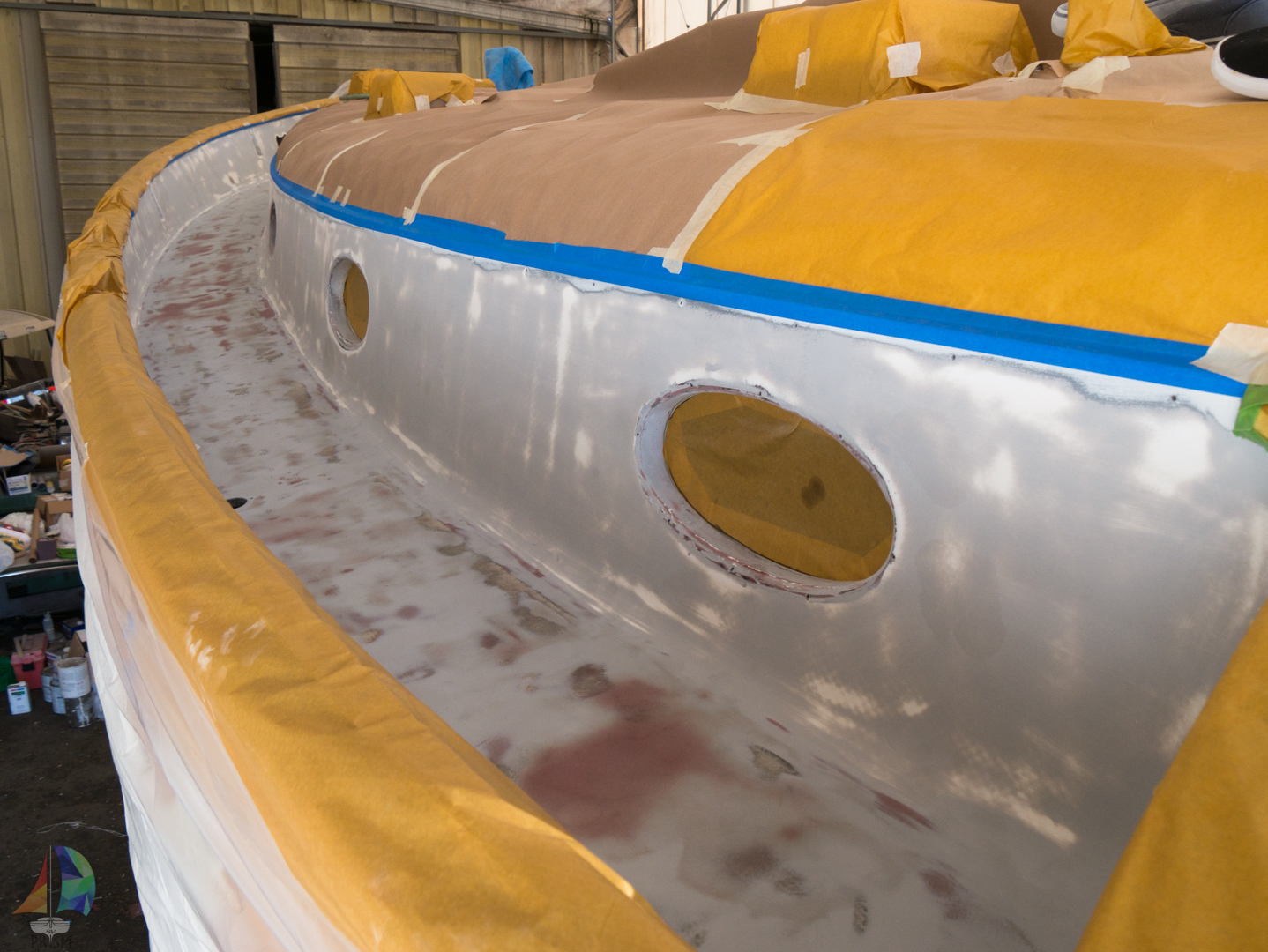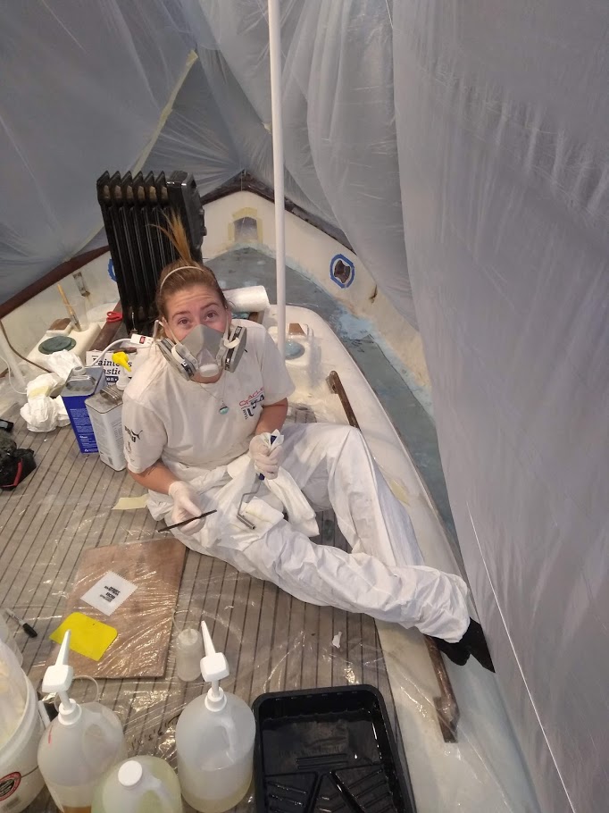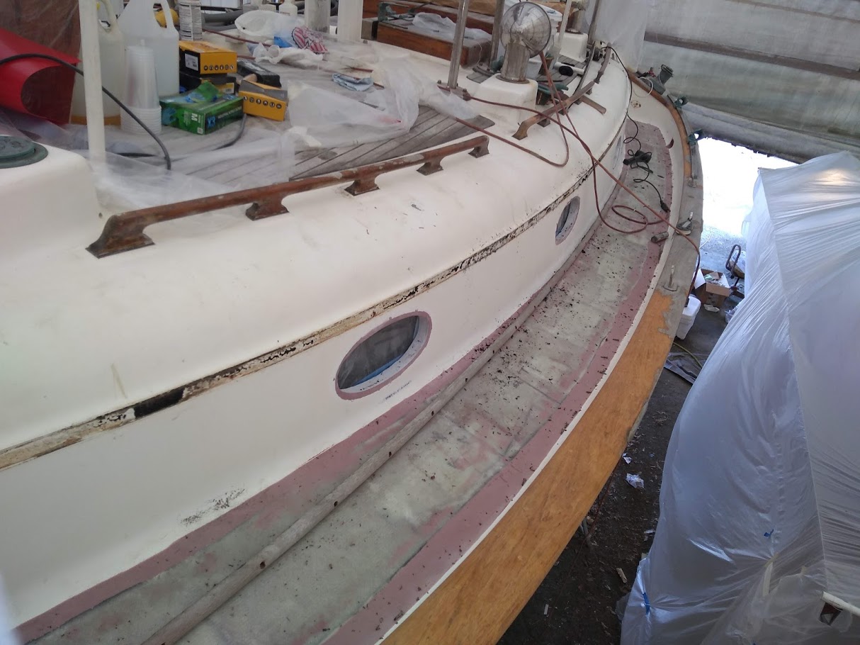 First up, figuring out the game plan of how we were going to paint the decks and cabin top without stepping on, in or around the previous coat. We knew we were going to have to do it in 2 stages and decided to use the eyebrow as the connection point between the cabin top and the deck. With this new game plan set in motion, we jumped right into getting the decks prepped and ready for barrier coat as we wanted to have that done before moving onto the cabin top.