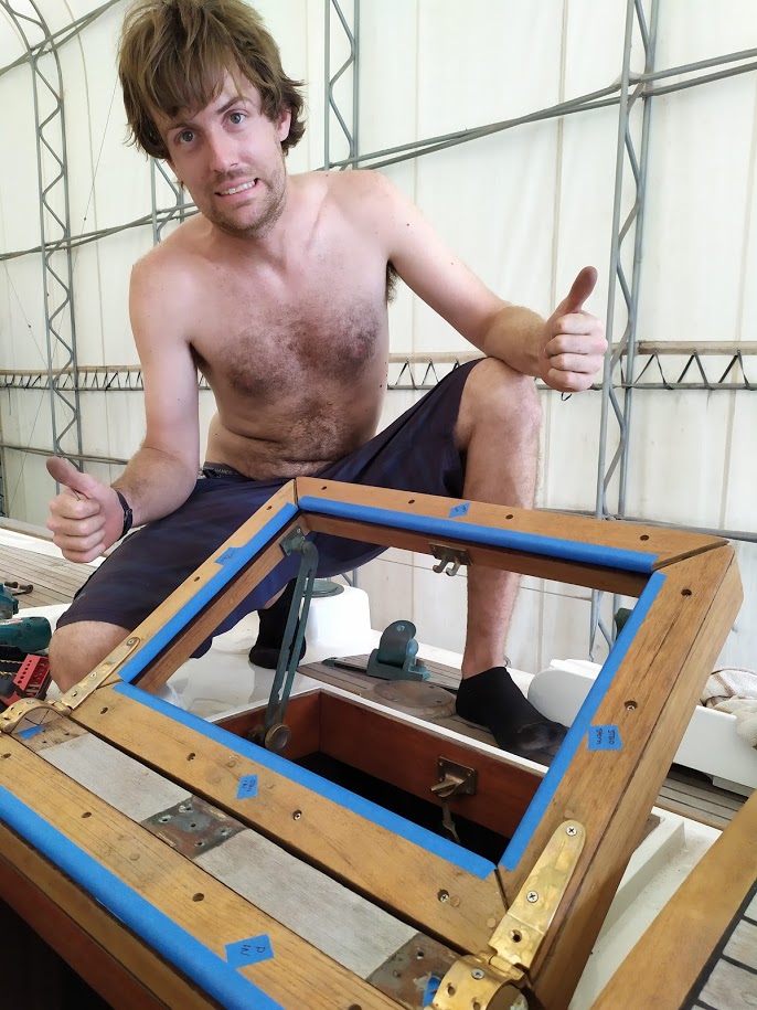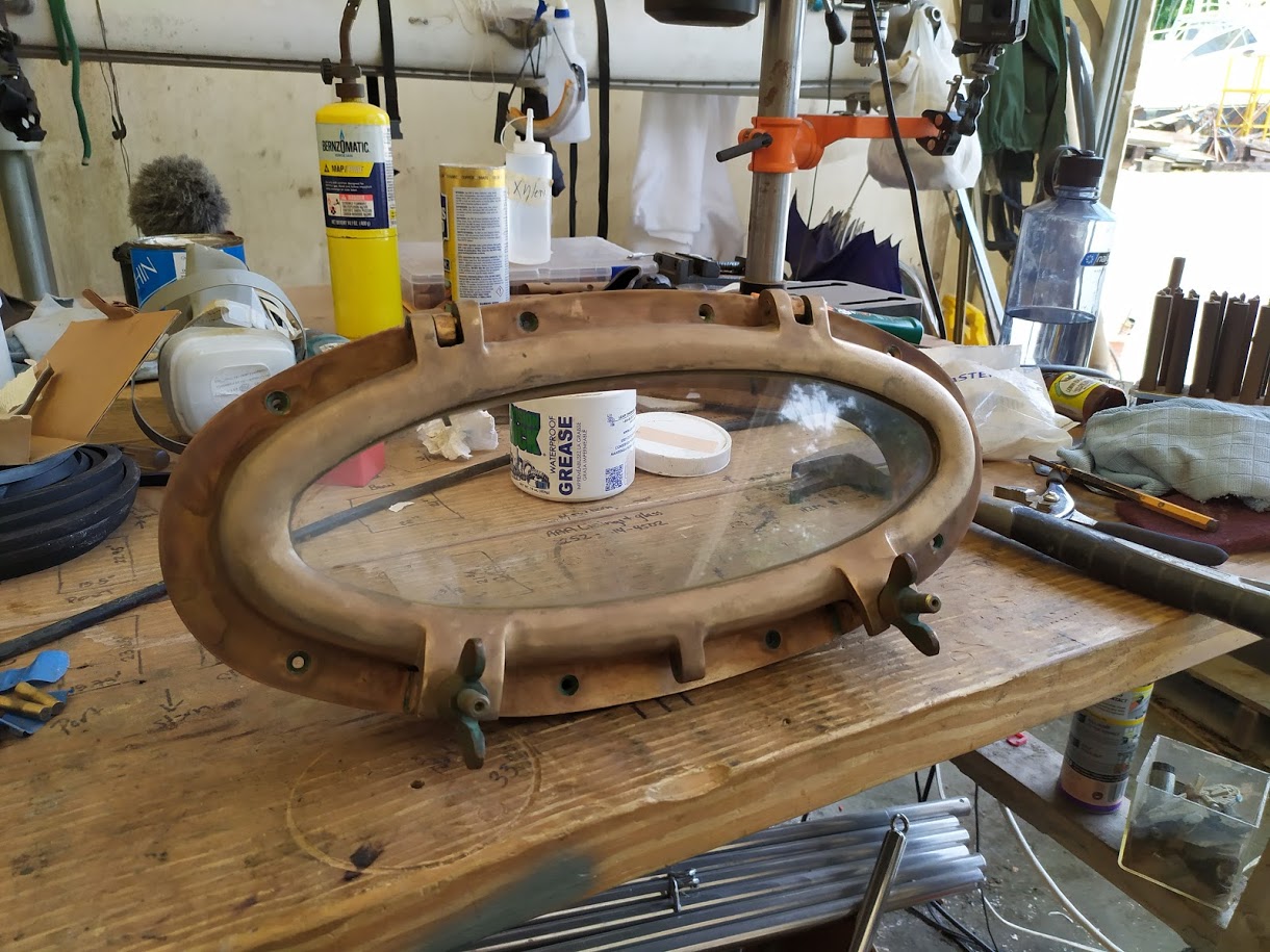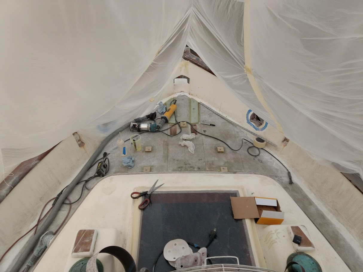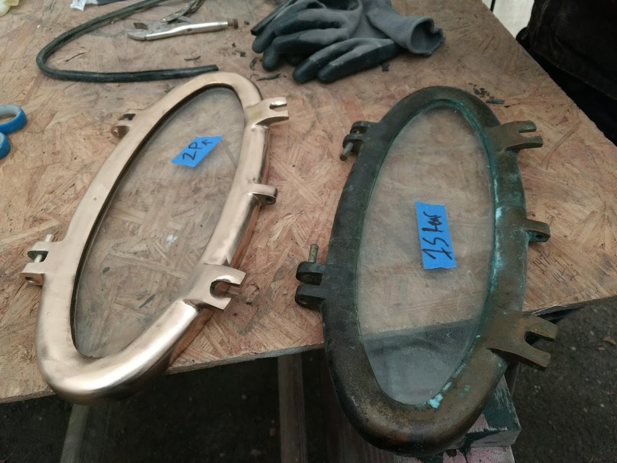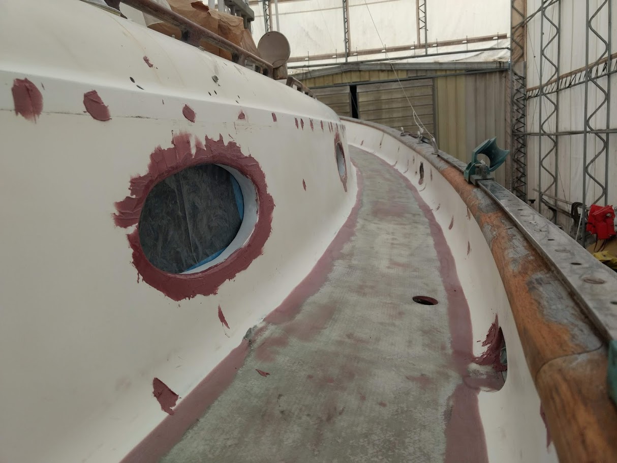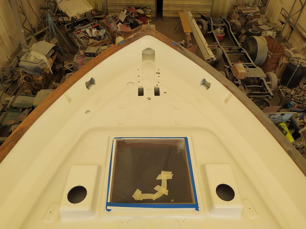 But before we could start on the paint, we needed to finish the port light holes. Yes, we did 99% of all work needed to the holes before we painted the inside, but we had not yet dry fitted them back into the new holes, nor had we cleaned them up. We also dry fitted the windlass bracket and dive compressor box and removed the teak eyebrow.