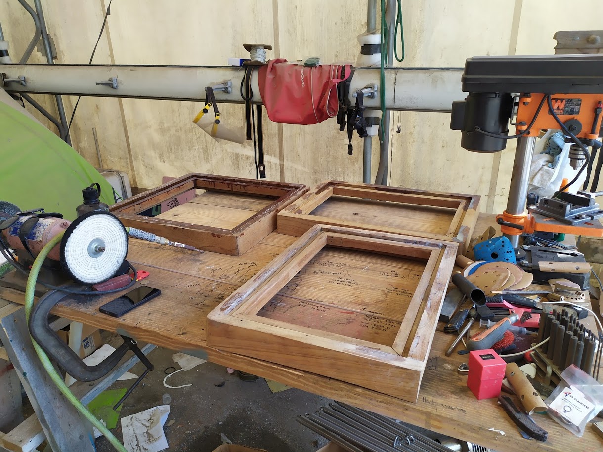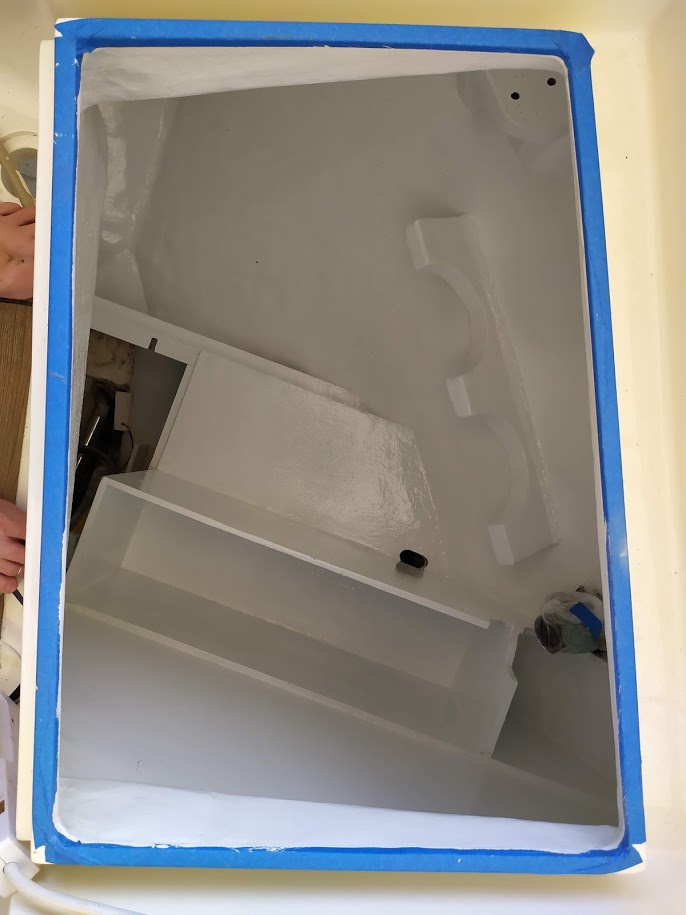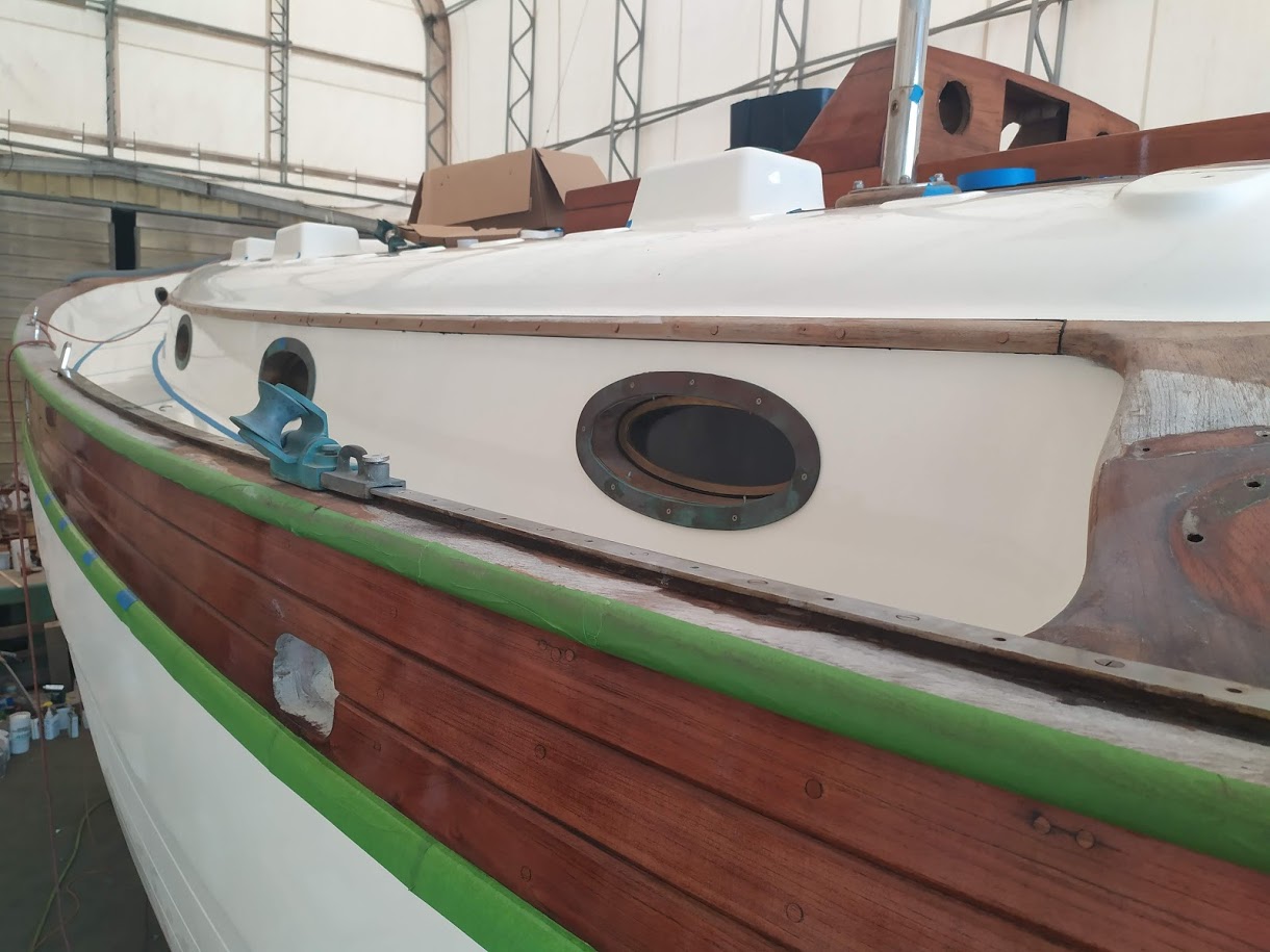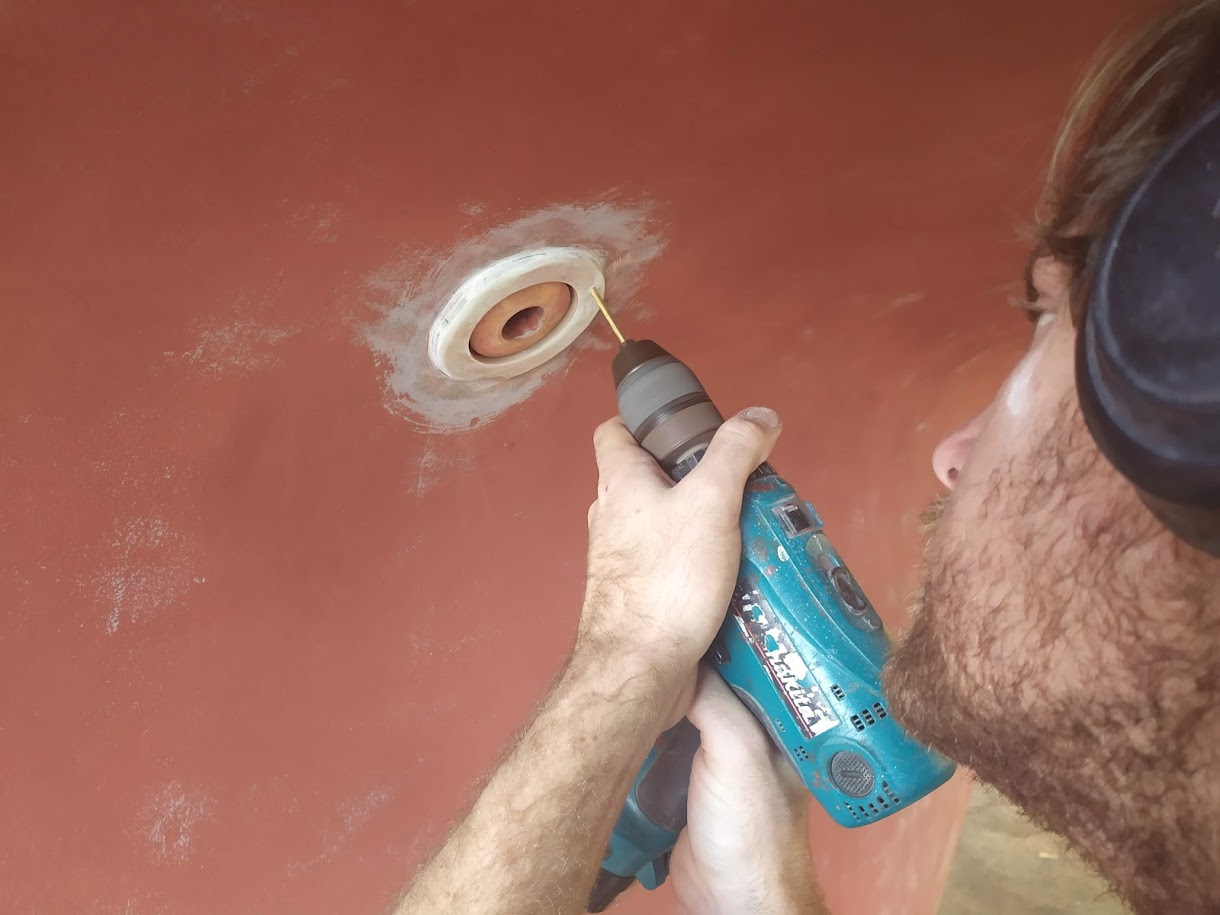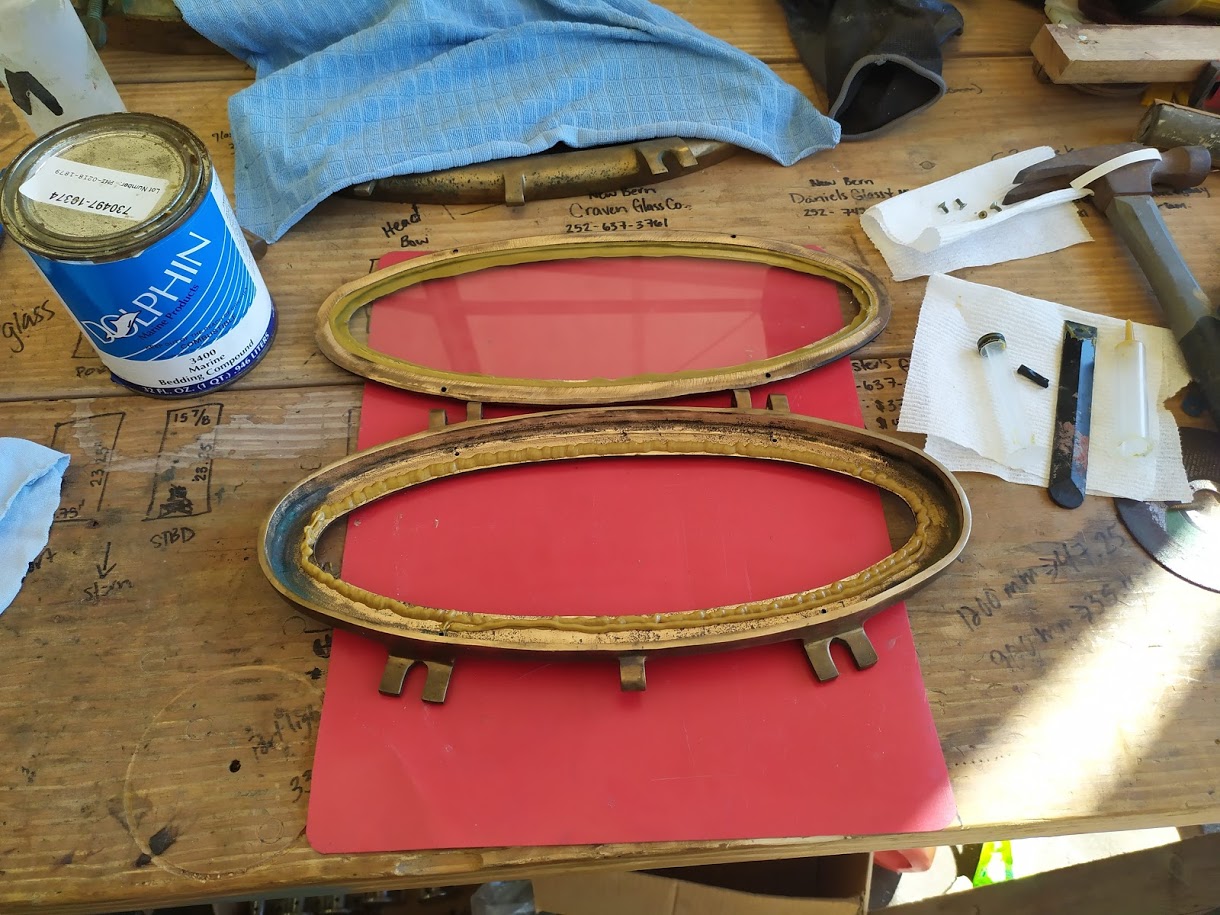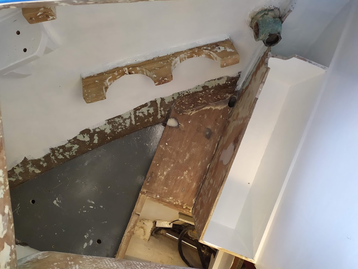 But before we could start on the paint, we needed to finish the port light holes. Yes, we did 99% of all work needed to the holes before we painted the inside, but we had not yet dry fitted them back into the new holes, nor had we cleaned them up. We also dry fitted the windlass bracket and dive compressor box and removed the teak eyebrow.